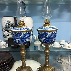 Cặp đèn dầu gốm men lam bọc đồng