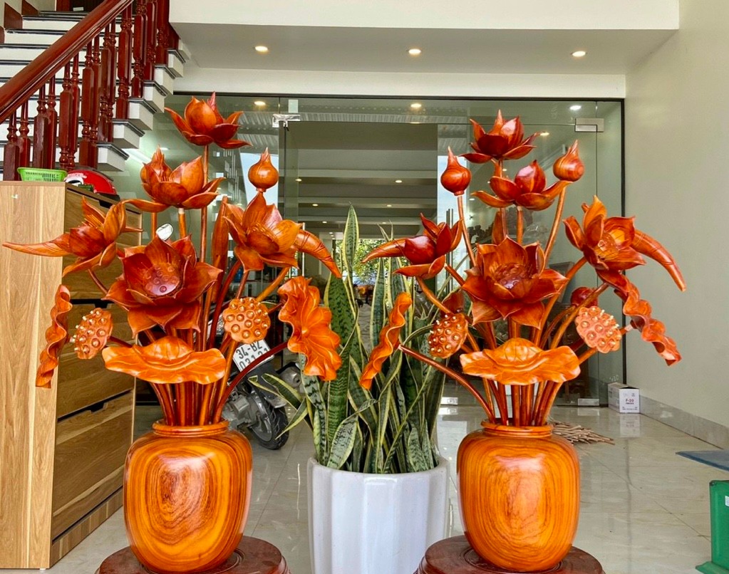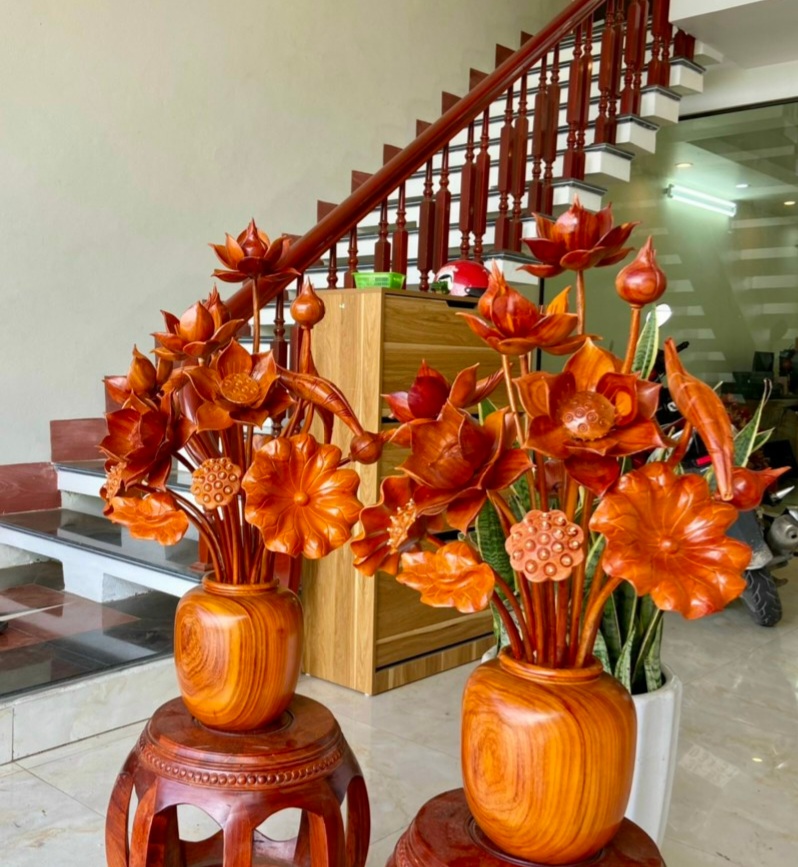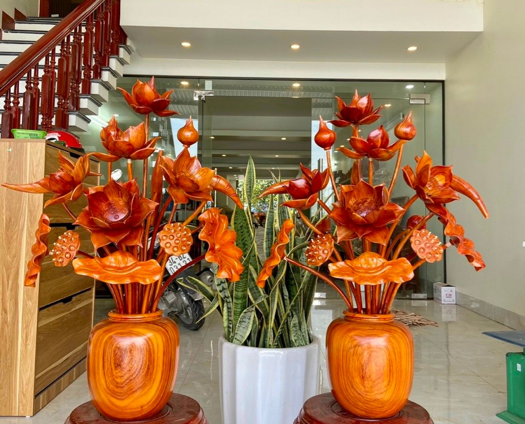 _ 2 bình hoa sen trang trí phòng thờ phòng khách ,được làm bằng chất liệu gỗ hương đỏ tự nhiên 100% _ Kt bình cắm 30×25cm + hoa lá gương cao tổng 92cm xòe