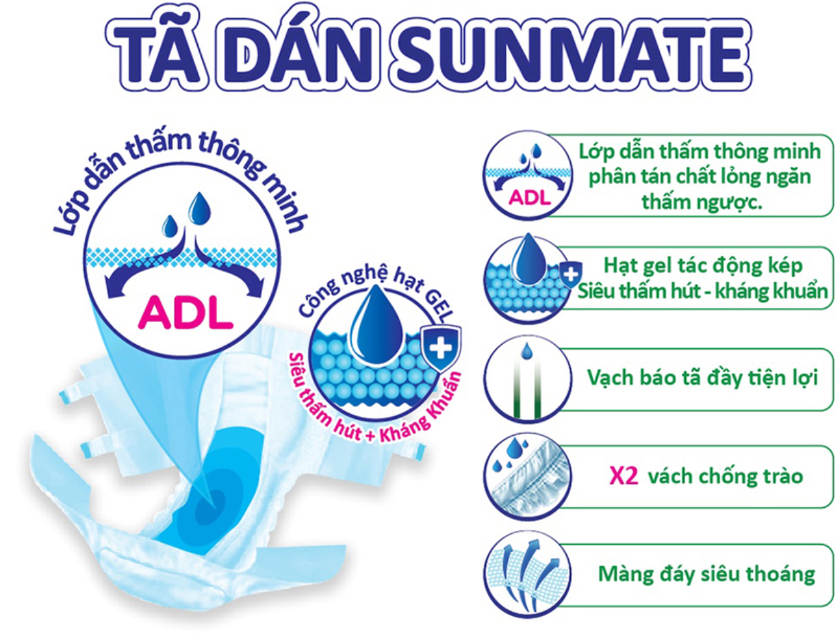 Chứa hạt siêu thấm, khả năng kháng khuẩn khử mùi Tã Dán Người Lớn SunMate có chứa hạt siêu thấm công nghệ mới, rất hiệu quả trong việc thấm hút, giúp ngăn ngừa tình trạng
