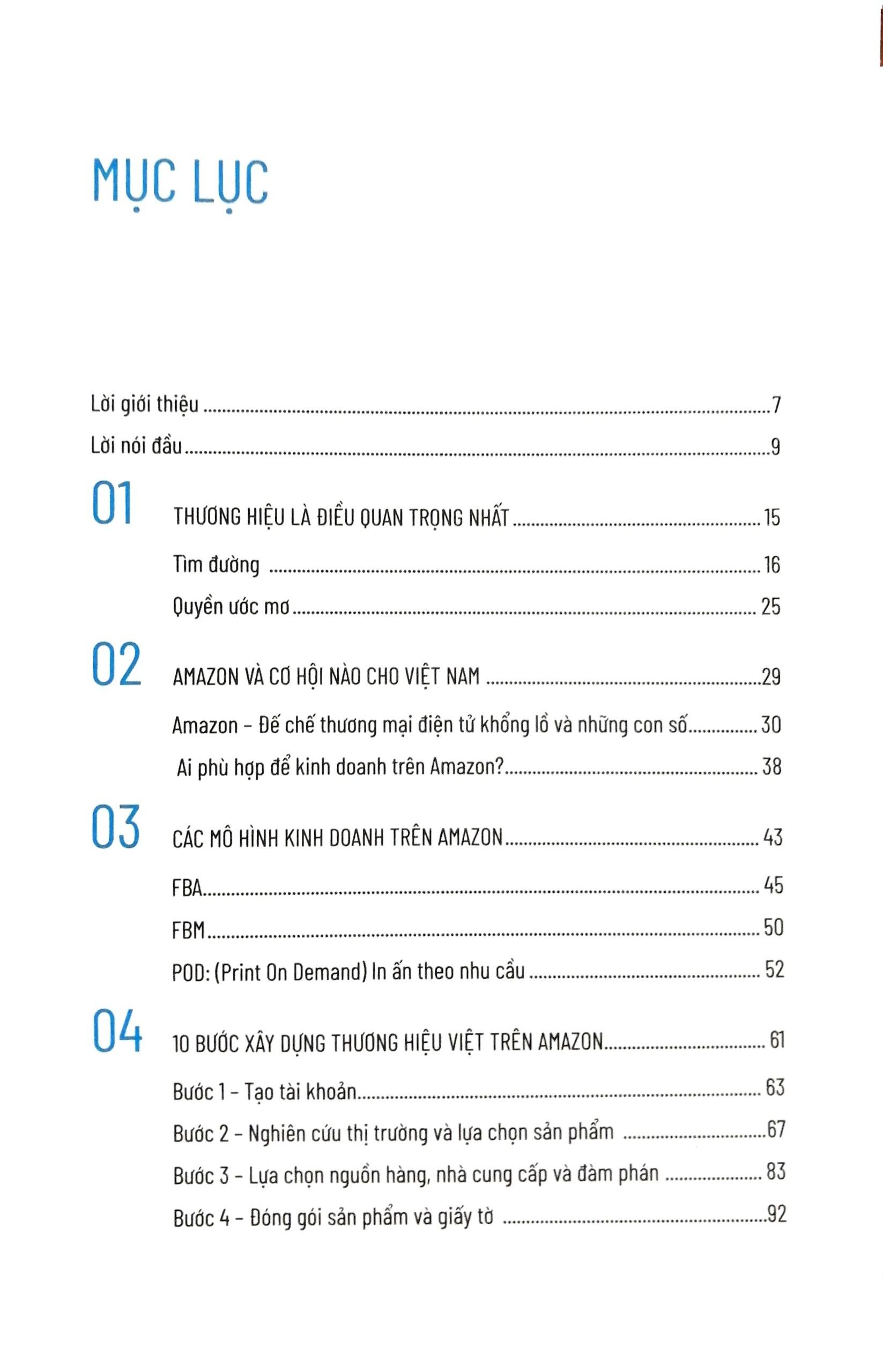 - Hướng dẫn cụ thể chi tiết 10 bước xây dựng thương hiệu Việt trên Amazon qua đó độc giả sẽ thấy được cách thức kinh doanh hiệu quả trên sàn thương mại điện tử khổng lồ này.