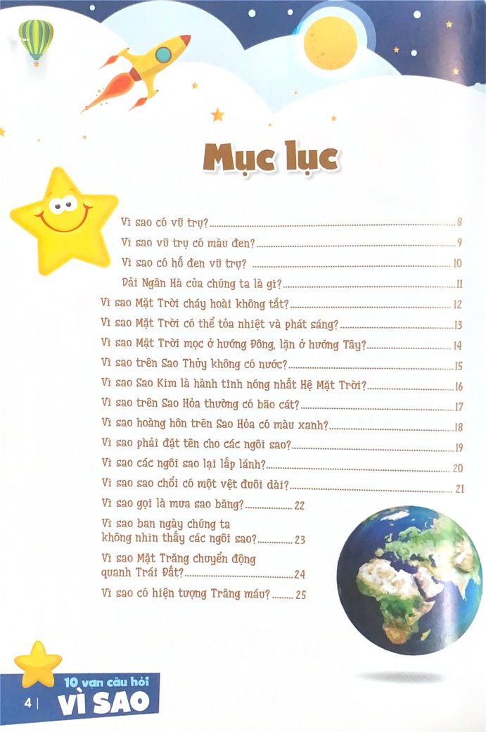 - Giới thiệu Thế giới xung quanh chúng ta vô cùng kỳ diệu nhưng cũng đầy bí ẩn. Trẻ nhỏ, đặc biệt là ở lứa tuổi thiếu nhi thường rất hiếu động và tò mò.= Trẻ không ngừng đặt ra những câu hỏi vì sao? tại sao? để khám phá và học hỏi thế giới xung quanh. Có những câu hỏi bố mẹ có thể trả lời, nhưng cũng có những điều thật khó để giải thích một cách đơn giản, dễ hiểu. Bộ sách “10 Vạn Câu Hỏi Vì Sao” chính là giải pháp cho các bậc phụ huynh giải đáp vô vàn thắc mắc từ các thiên thần nhỏ chủa mình. Bao gồm nhiều chủ đề khác nhau: