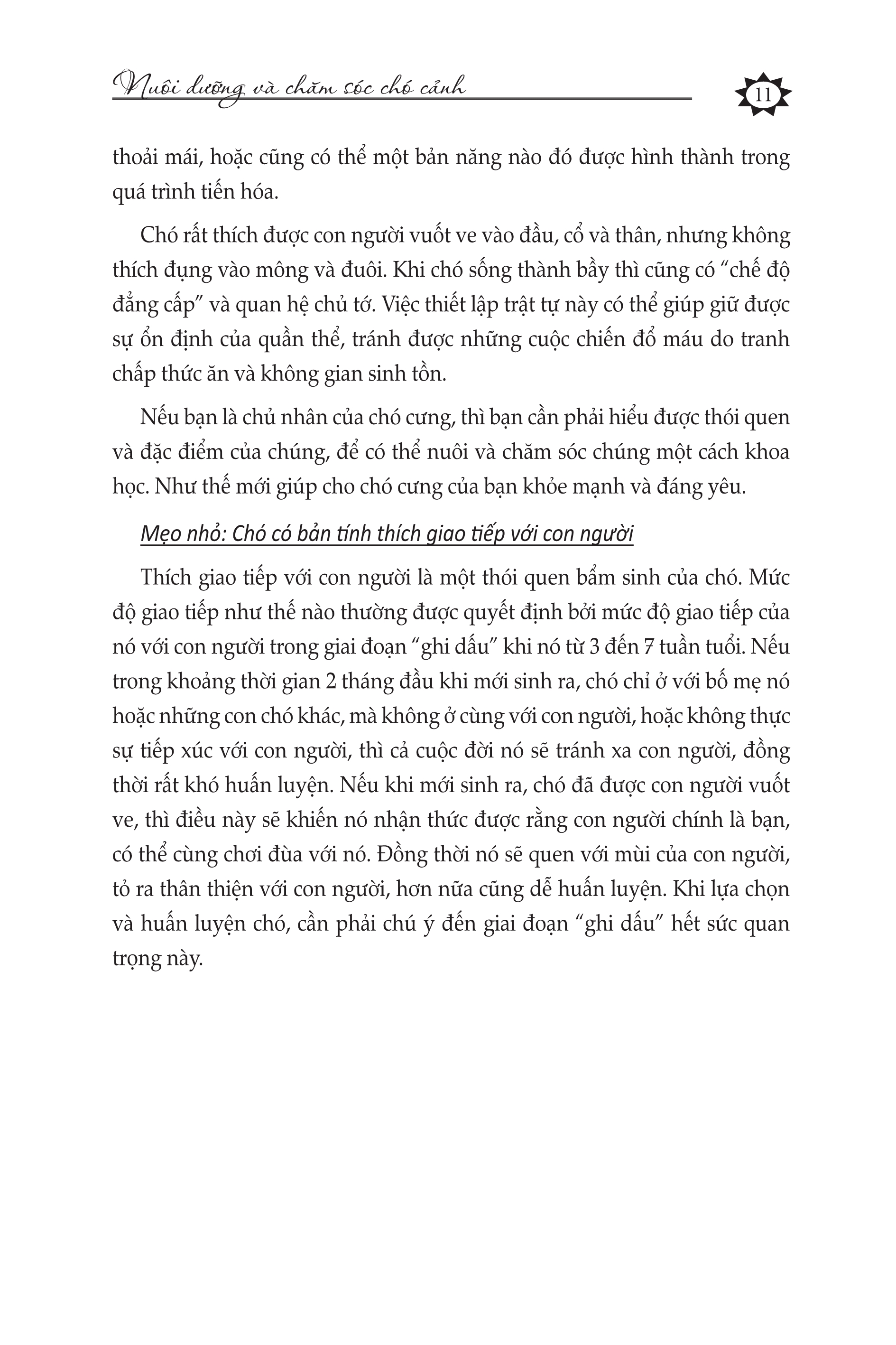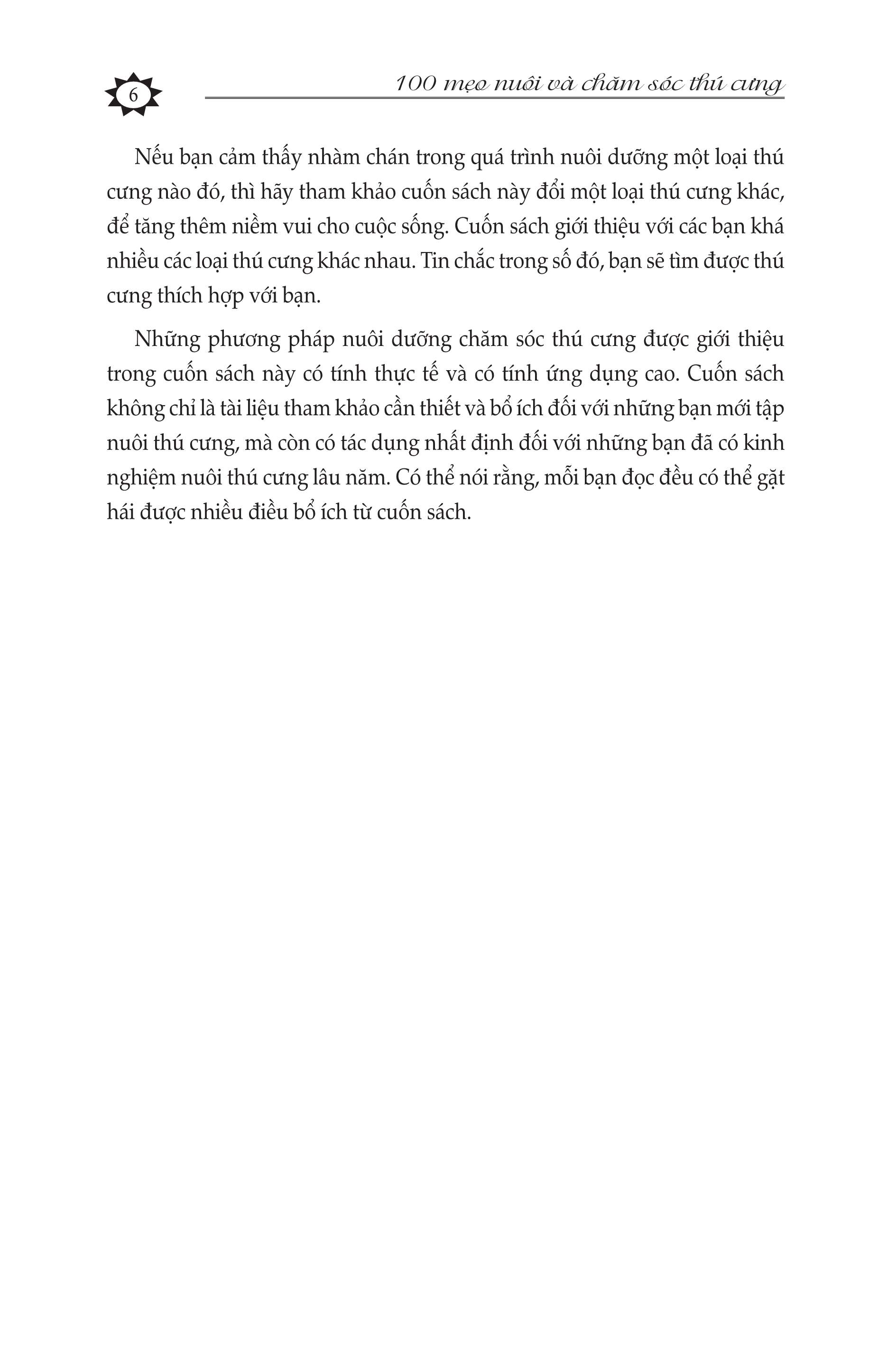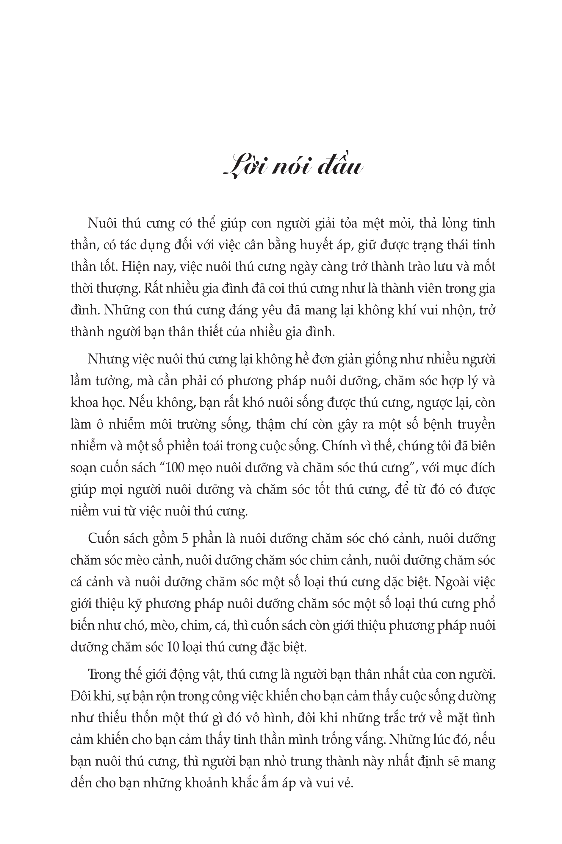 Nhưng việc nuôi thú cưng lại không hề đơn giản giống như nhiều người lầm tưởng, mà cần phải có phương pháp nuôi dưỡng, chăm sóc hợp lý và khoa học. Nếu không, bạn rất khó nuôi sống được thú cưng, ngược lại, còn làm ô nhiễm môi trường sống, thậm chí còn gây ra một số bệnh truyền nhiễm và một số phiền toái trong cuộc sống. Chính vì thế, chúng tôi đã biên soạn cuốn sách “100 mẹo nuôi dưỡng và chăm sóc thú cưng”, với mục đích giúp mọi người nuôi dưỡng và chăm sóc tốt thú cưng, để từ đó có được niềm vui từ việc nuôi thú cưng.
