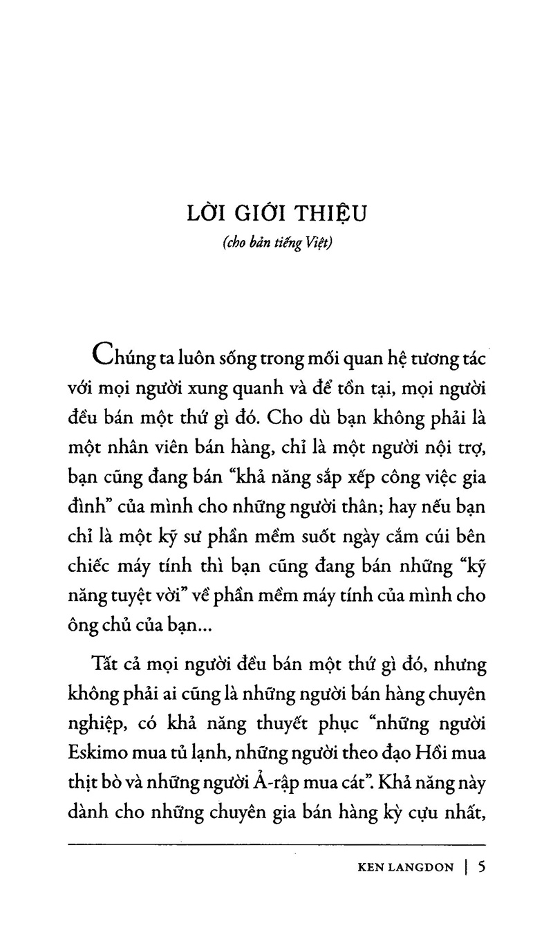 Chúng ta luôn sống trong mối quan hệ tương tác với mọi người xung quanh và để tồn tại, mọi người đều bán một thứ gì đó. Cho dù bạn không phải là một nhân viên bán hàng, chỉ là một người nội trợ, bạn cũng đang bán “khả năng sắp xếp công việc gia đình” của mình cho những người thân; hay nếu bạn chỉ là một kỹ sư phần mềm suốt ngày cắm cúi bên chiếc máy tính thì bạn cũng đang bán những “kỹ năng tuyệt vời” về phần mềm máy tính của mình cho ông chủ của bạn… Tất cả mọi người đều bán một thứ gì đó, nhưng không phải ai cũng là những người bán hàng chuyên nghiệp, có khả năng thuyết phục “những người Eskimo mua tủ lạnh, những người theo đạo Hồi mua thịt bò và những người Ả-rập mua cát”. Khả năng này dành cho những chuyên gia bán hàng kỳ cựu nhất, những người không biết lùi bước trước thất bại. Họ có những kỹ năng bán hàng tuyệt vời đã được tôi luyện qua thời gian và những trải nghiệm của cuộc sống.