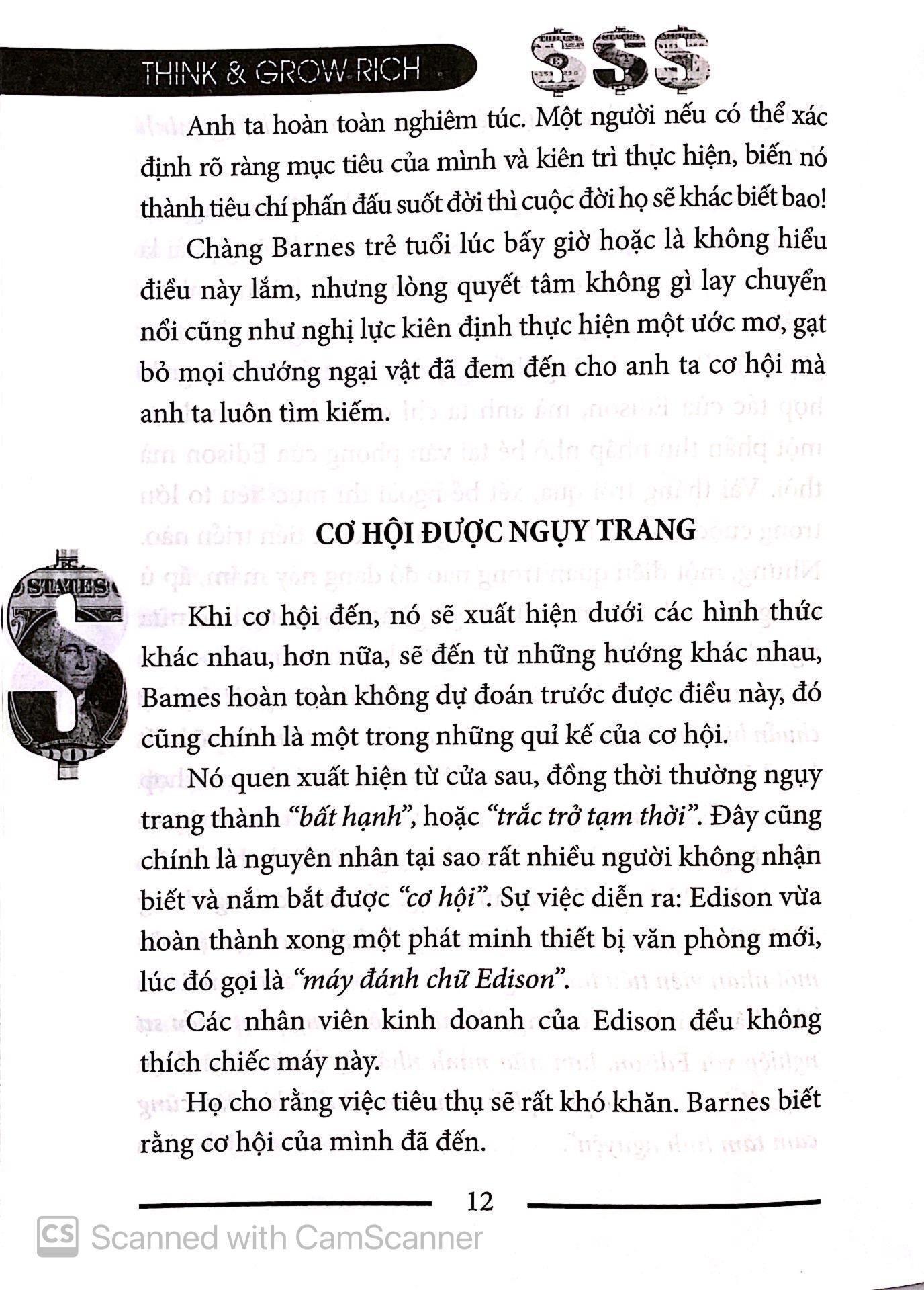 “Ý niệm tạo nên hiện thực”, điều này hoàn toàn đúng đắn, đặc biệt là khi ý tưởng kết hợp với một mục đích đã định, nghị lực cũng như sự mong muốn biến ý tưởng thành của cải hoặc các mục tiêu khác, thì ý tưởng sẽ càng là một sự thực có đầy đủ sức mạnh. CÁI GỌI LÀ CONTROLUTT. Tú Nhiều năm trước đây, EdwinC. Barnes đã phát hiện rằng “tư duy để làm giàu” là một sự thật không gì bác bỏ được. Phát hiện của ông nhờ vào sự tích lũy dần dần, bắt nguồn từ niềm khát khao cháy bỏng muốn trở thành người hợp tác với Edison. PC Kháng VTCN Thành 3 con BỘ Một trong những đặc trưng chủ yếu của niềm khát khao của Bames chính là sự rõ ràng và kiên định. Ông muốn cùng hợp tác làm ăn với Edison chứ không đơn thuần chỉ là “làm việc cho Edison”. Quan sát kỹ quá trình biến ý tưởng thành hiện thực của ông, bạn sẽ càng thấu hiểu hơn các nguyên tắc làm giàu. Khi nỗi khát khao hay ý niệm này lần đầu tiên vụt qua trong đầu, ông hoàn toàn không có tiền để thực hiện nó. Ông đứng trước hai khó khăn: thứ nhất là, ông không hề quen biết Edison; thứ hai là, ngay cả tiền mua một chiếc vé tàu đến bang New Jersy ông cũng chẳng có. Hai khó khăn này hoàn toàn có thể khiến đại đa số người khác nguội lạnh, nản lòng, dẫn đến từ bỏ việc thực hiện ý tưởng đó. Nhưng, sự khao khát của Bames lại cháy bỏng hơn người.