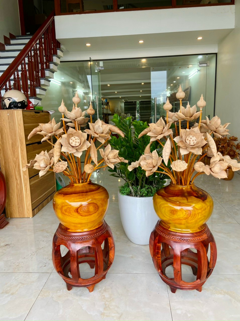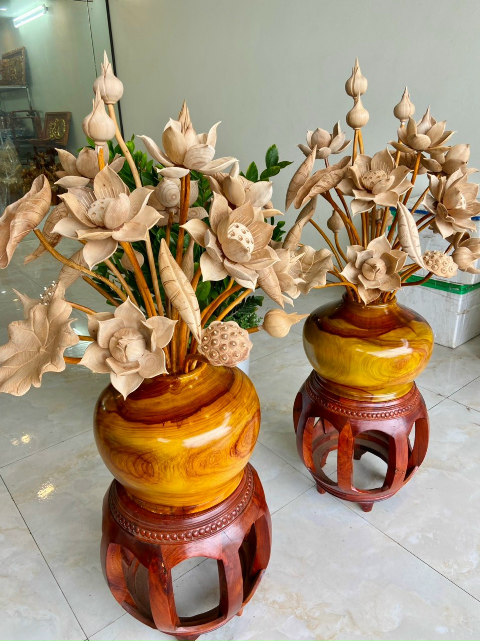 _ 2 bình hoa sen trang trí phòng thờ phòng khách ,được làm bằng chất liệu gỗ hương đỏ tự nhiên 100% _ Kt bình cắm 30×25cm + hoa lá gương cao tổng 92cm xòe