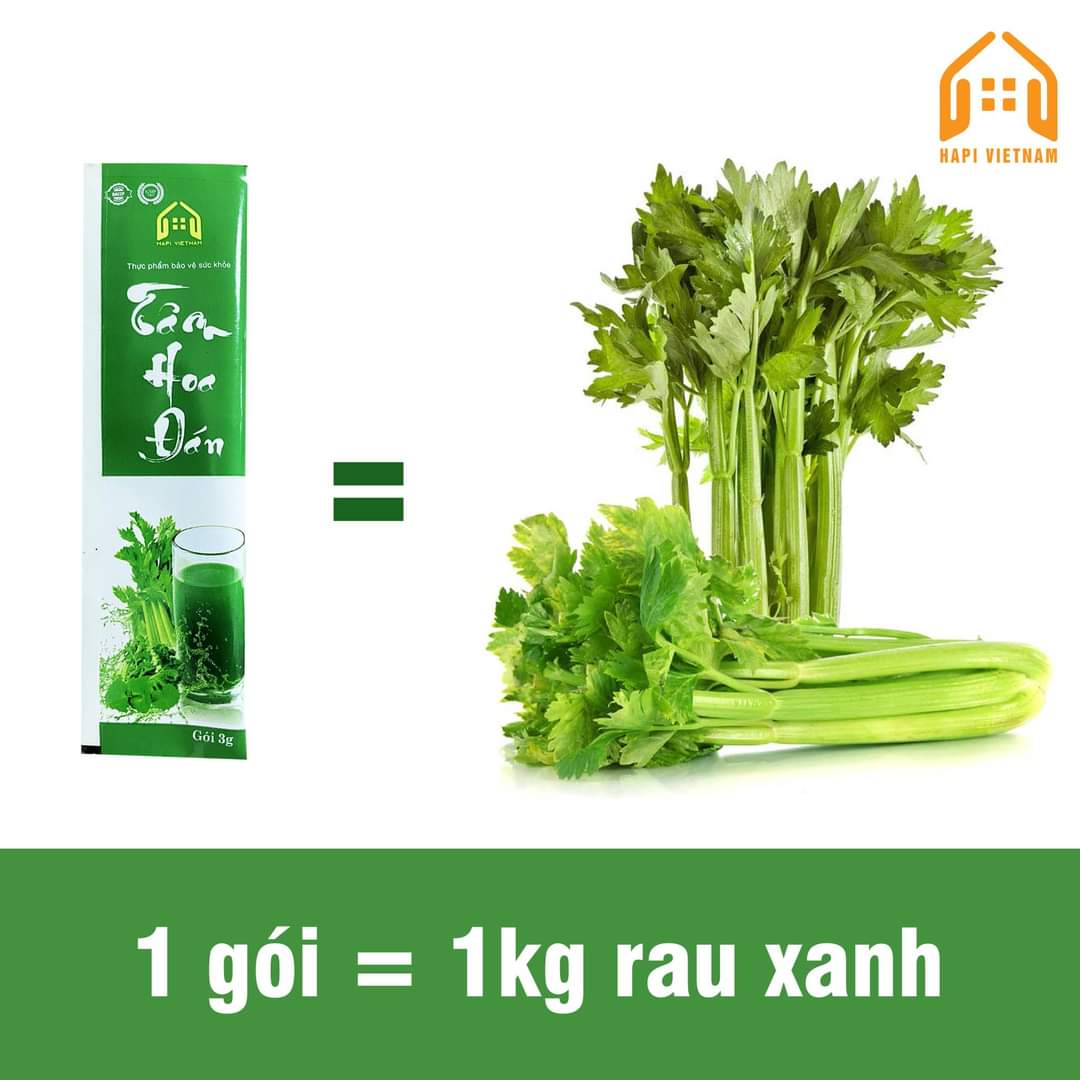 Mô tả sản phẩm - Trong gói 3g có chứa: - Bột Cần tây: - Collagen peptide: - Bột Diệp lục 10% (Chlorophyll): - L-Glutathion 10%: - Bột Cải xoăn: - Bột Rau má: -