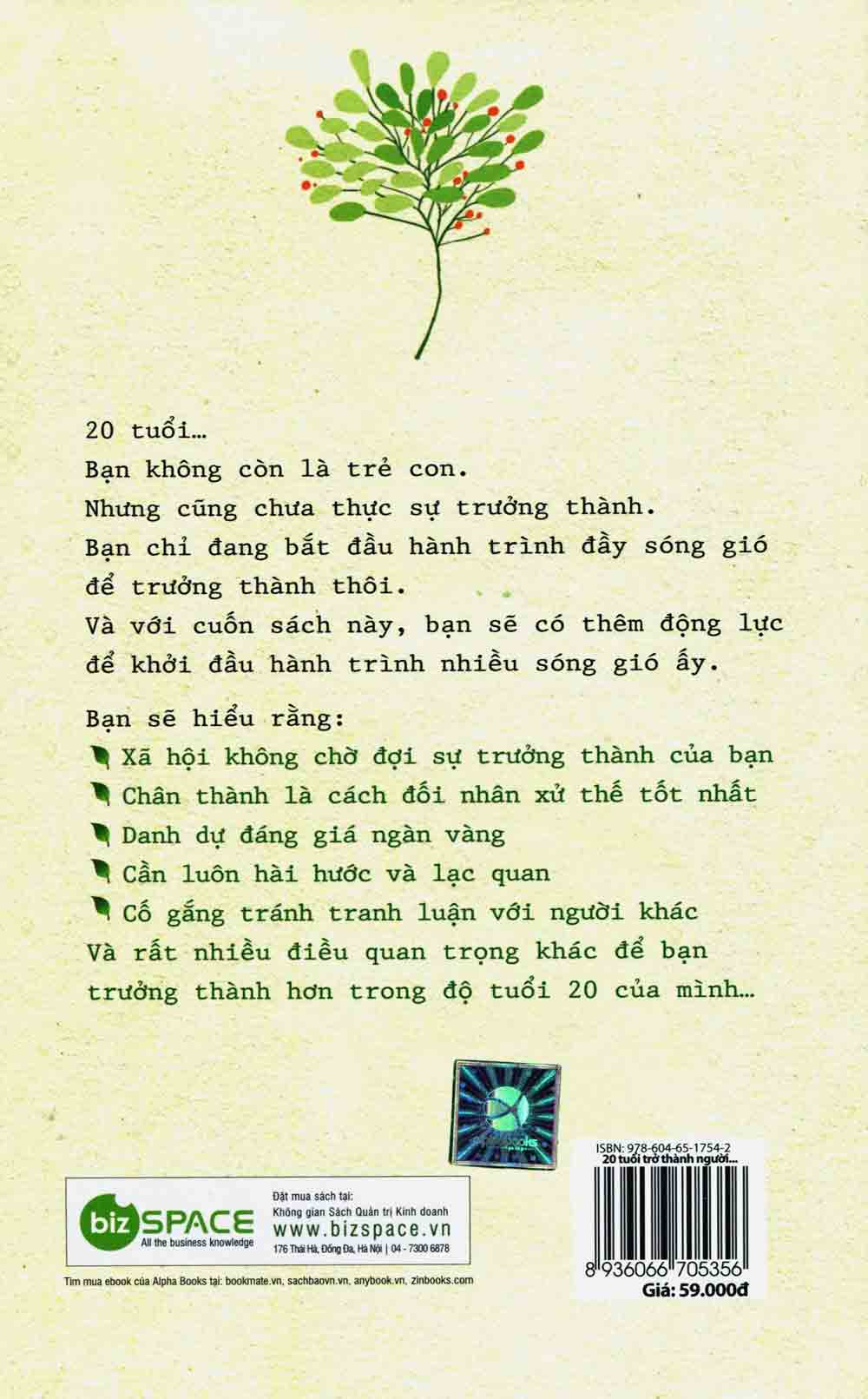 20 Tuổi Trở Thành Người Biết Nói Giỏi Làm   Đây là thời gian để bắt đầu đưa ra lựa chọn có chủ ý về công việc, thành phố và thậm chí cả cuộc sống tình yêu để thiết lập cuộc sống mà bạn muốn có ở tuổi 30 của mình. Bạn cần phải tìm ra nghề nghiệp hoàn hảo để làm thay vì tiếp tục tìm kiếm công việc trong mơ tuyệt đối, nhận một công việc không phải là lý tưởng cũng không sao, miễn là có điều gì trong đó có thể dẫn đến công việc khác, cơ hội tốt hơn trong tương lai. Cuốn sách 20 tuổi trở thành người biết nói giỏi làm tổng hợp 35 kỹ năng không thể thiếu để bạn luôn giữ được sự bình tĩnh và tìm ra cách ứng đối thông minh trong mọi tình huống giao tiếp: Làm thế nào để cư xử chân thành nhưng vẫn không khiến cho người khác phải phật lòng? Làm sao để khen ngợi người khác nhưng không tạo cảm giác xu nịnh? Làm sao để thuyết phục người khác mà không “khơi mào” cho tranh luận tiêu cực? Làm thế nào để hình ảnh của bạn luôn đẹp và chiếm được cảm tình của người khác? Làm sao để đối phó với những lời nói xấu sau lưng và giữ gìn danh dự của mình?