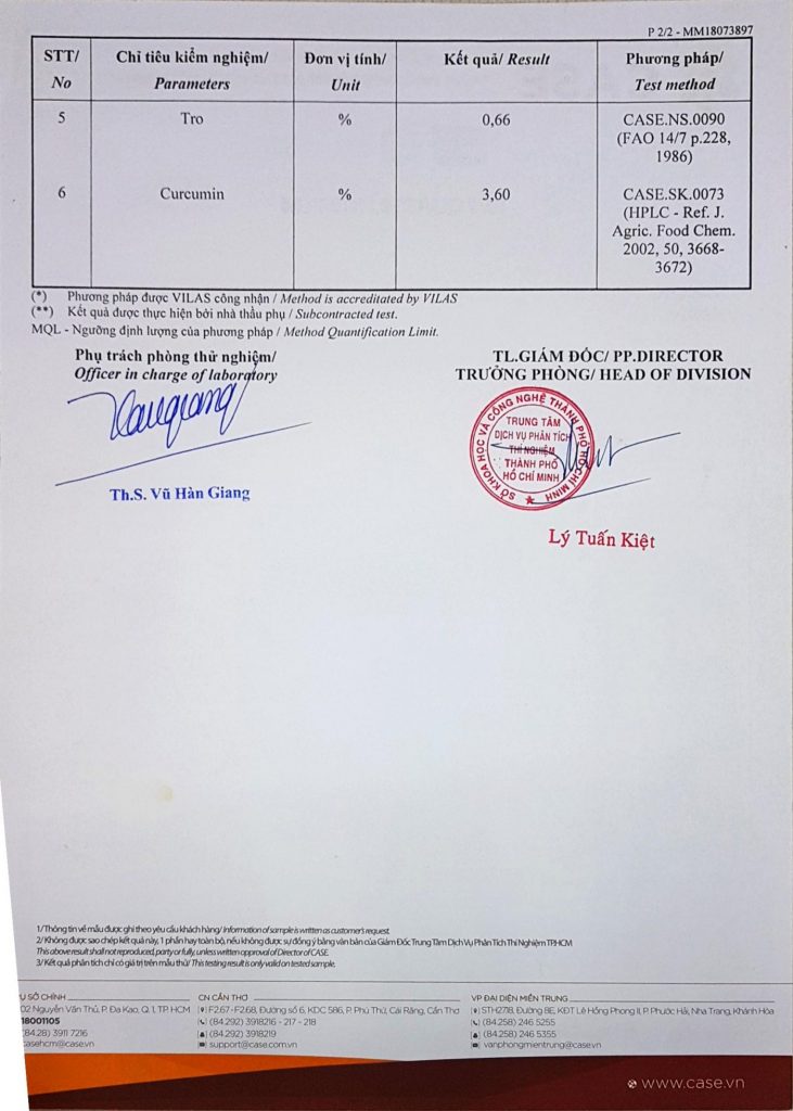 THÀNH PHẦN: nguyên chất 100% tinh bột nghệ vàng Combo sản phẩm gồm 2 lon, mỗi lon 500gr Hàm lượng curcumin từ: 88 - 758mg/kg Không chất bảo quản, không phẩm màu Đã tách dầu,