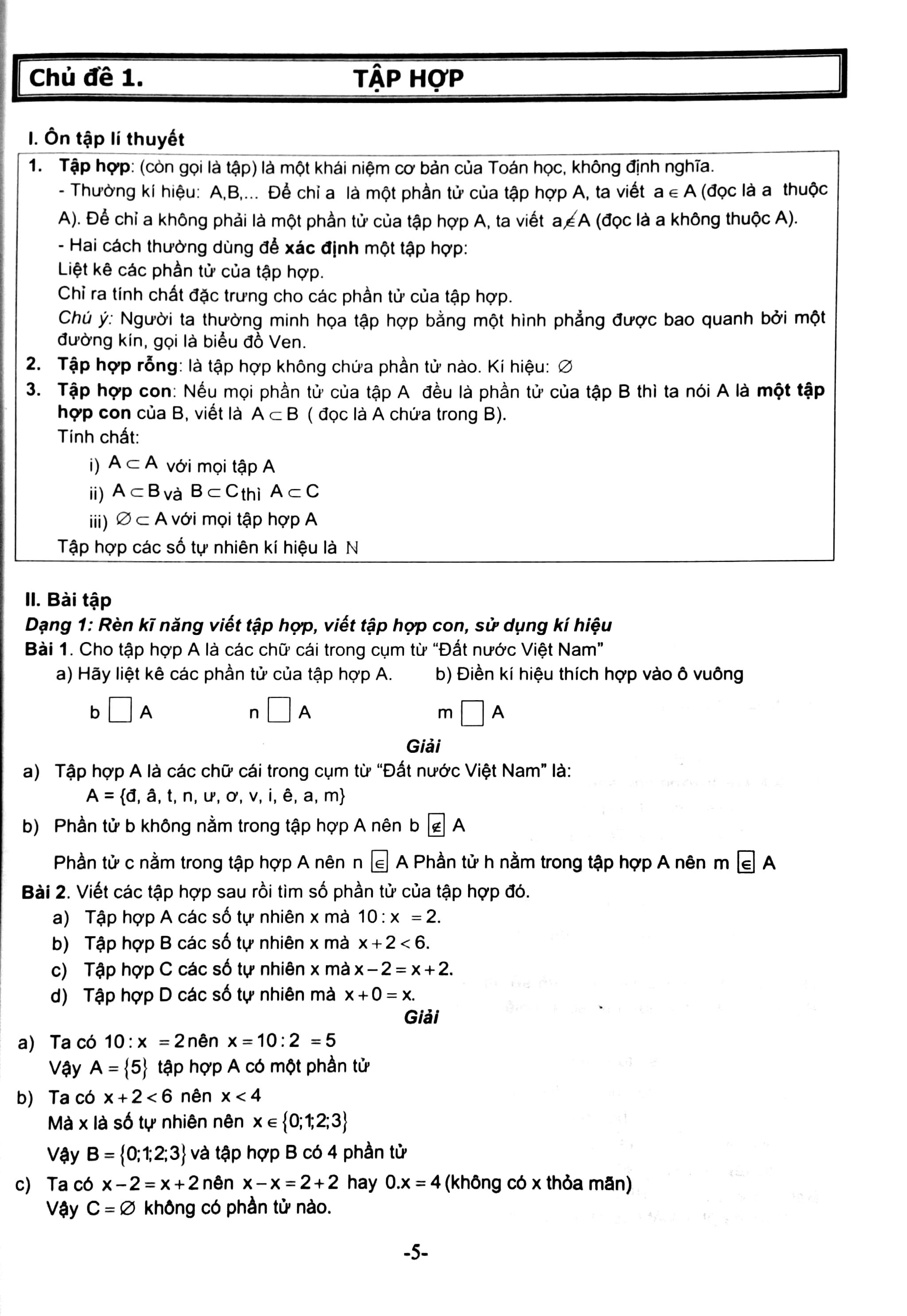- Bài tập rèn luyện và hướng dẫn giải Trong mỗi chủ đề, phần bài tập minh họa được chia thành các dạng toán tương ứng với nội dung của chủ đề. Hệ thống bài tập được trình bày theo thứ tự từ mức độ dễ đến khó dần và sắp xếp theo các chủ đề tương ứng với các bài học của sách giáo khoa mới. Đặc biệt, chúng tôi cố gắng biên soạn đầy đủ các nội dung để cuốn sách có thể sử dụng được cho tất cả các bộ sách giáo khoa mới, các bài toán là cơ bản, bám sát chương trình các bộ sách, đa dạng về thể loại bài tập. Chúng tôi hy vọng, cuốn sách sẽ đáp ứng với một lượng lớn các bạn đọc: từ các em học sinh đến các thầy cô và các bậc phụ huynh. Mặc dù có nhiều cố gắng nhưng chắc chắn không tránh khỏi các sai sót. Vì vậy, mong đọc giả chân thành góp ý để lần tái bản sau được tốt hơn.