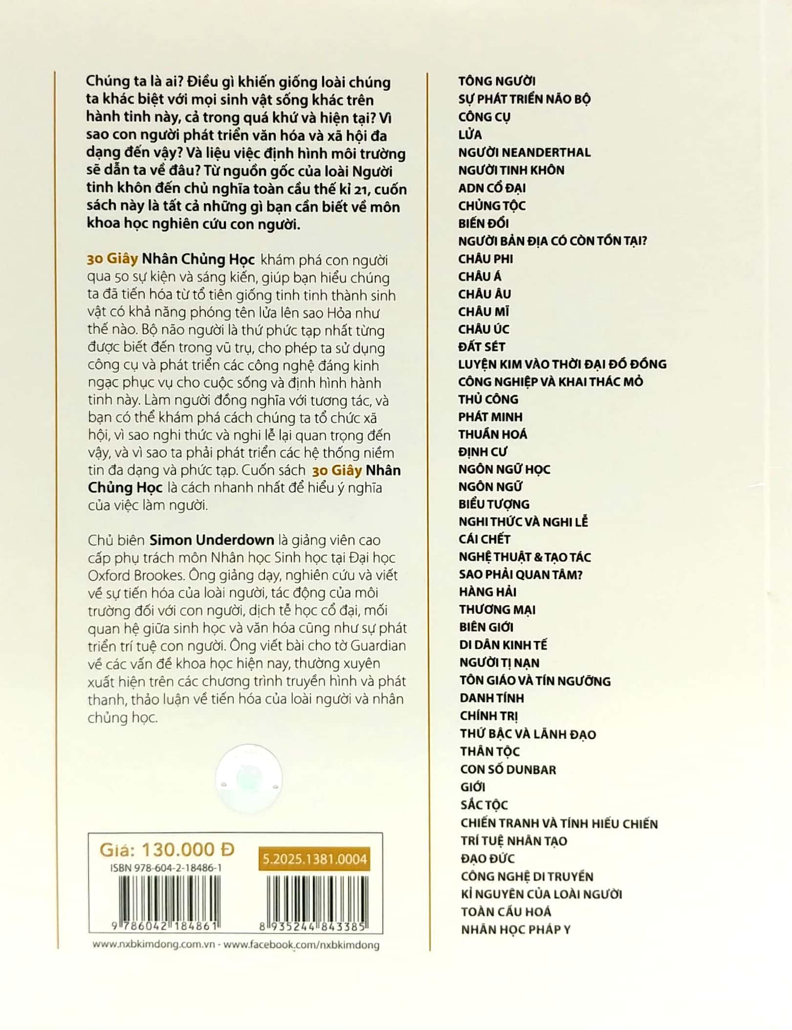 30 Giây Nhân Chủng Học khám phá con người qua 50 sự kiện và sáng kiến, giúp bạn hiểu chúng ta đã tiến hóa từ tổ tiên giống tinh tinh thành sinh vật có khả năng phóng tên lửa lên sao Hỏa như thế nào. Bộ não người là thứ phức tạp nhất từng được biết đến trong vũ trụ, cho phép ta sử dụng công cụ và phát triển các công nghệ đáng kinh ngạc phục vụ cho cuộc sống và định hình hành tinh này. Làm người đồng nghĩa với tương tác, và bạn có thể khám phá cách chúng ta tổ chức xã hội, vì sao nghi thức và nghi lễ lại quan trọng đến vậy, và vì sao ta phải phát triển các hệ thống niềm tin đa dạng và phức tạp. Cuốn sách 30 Giây Nhân Chủng Học là cách nhanh nhất để hiểu ý nghĩa của việc làm người.