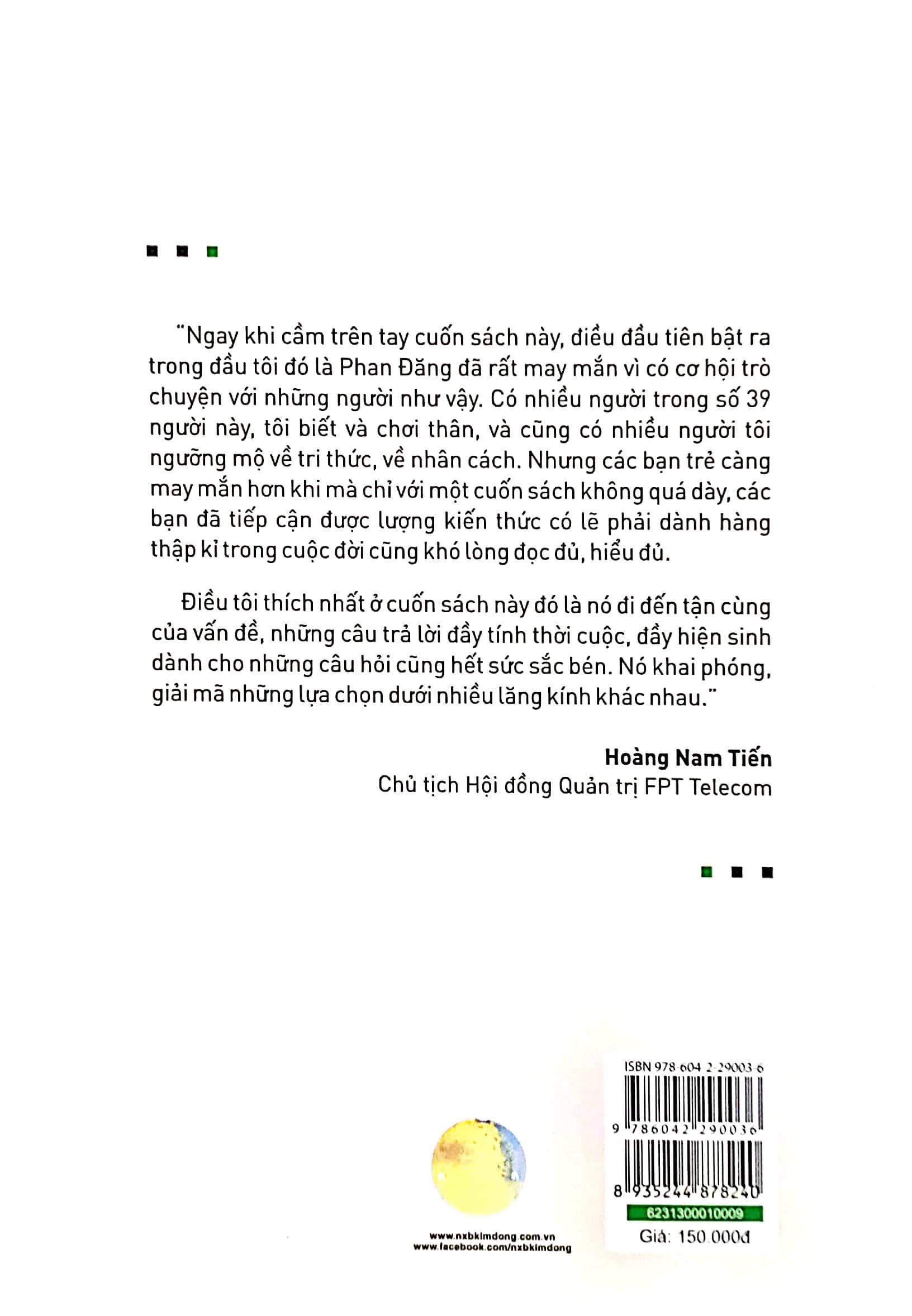 Người trẻ ngày nay phải đối diện trước vô vàn lựa chọn, làm thế nào chúng ta có thể đưa ra lựa chọn đúng đắn và hợp lí ở giai đoạn chập chững bước vào đời? Người trẻ nên sống như thế nào trong thời đại mới? Nên tin và lựa chọn thế nào trong xã hội đầy biến động? Chúng ta phải học ra sao để chung sống với những sản phẩm công nghệ ngày càng thông minh hơn? Câu trả lời chính là học hỏi kinh nghiệm và tiếp thu tri thức từ những bậc tiền bối đi trước. 39 Cuộc Đối Thoại Cho Người Trẻ là 39 câu chuyện, 39 tâm sự, 39 khắc khoải, 39 thông điệp muốn sẻ chia, được chắt lọc từ kinh nghiệm và vốn sống dạn dày của 39 trí thức trong những lĩnh vực khác nhau, thuộc nhiều thế hệ khác nhau. Tuy mỗi người theo đuổi một lĩnh vực tri thức khác nhau, nhưng tựu trung lại, tất cả đều bày tỏ niềm tin chân thành, da diết và đầy sức nặng. 39 Cuộc Đối Thoại Cho Người Trẻ sẽ cùng bạn đi đến tận cùng của rất nhiều vấn đề, hiện tượng nổi cộm trong cuộc sống xã hội đương đại. Xuyên suốt cuốn sách, bạn đọc được lắng nghe câu chuyện, nhìn nhận vấn đề dưới nhiều lăng kính khác nhau, từ những nhà nghiên cứu như GS TS Trần Ngọc Vương, PGS TS Nguyễn Lân Hiếu… đến những “thiên tài” từng gây chấn động như Lê Bá Khánh Trình, Phạm Kim Hùng, cả những văn nghệ sĩ đầy sức ảnh hưởng như ca sĩ Tùng Dương, nhà văn Nguyễn Bình Phương và cả những người hoạch định chính sách và giữ vị trí quan trọng là Đại sứ Mĩ tại Việt Nam ông Daniel J. Kritenbrink, người phát ngôn Bộ Ngoại giao Việt Nam Lê Thị Thu Hằng… Thông qua những chia sẻ trong 39 Cuộc Đối Thoại Cho Người Trẻ, bạn đọc có thể hiểu hơn về lẽ đời, lẽ người, và biết đâu sẽ có thêm chút ít hành trang để bước vào một đời sống với muôn nẻo thách thức, cam go, thuận lợi, dễ dàng, đau thương, hạnh phúc vốn không bao giờ biết trước.