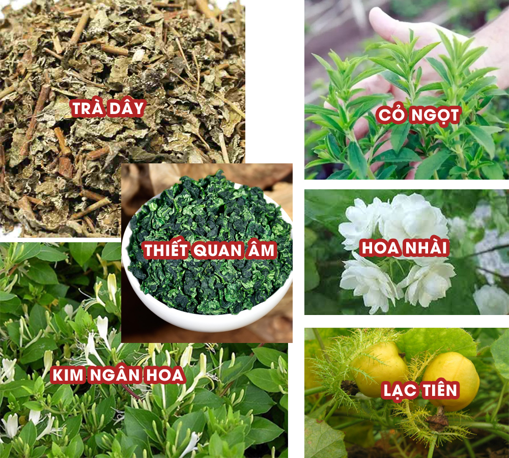 Trà Thảo Mộc Kingtea có thành phần gồm: Trà dây, Cỏ ngọt, Hoa nhài, Kim ngân hoa, Lạc tiên, sơn mật