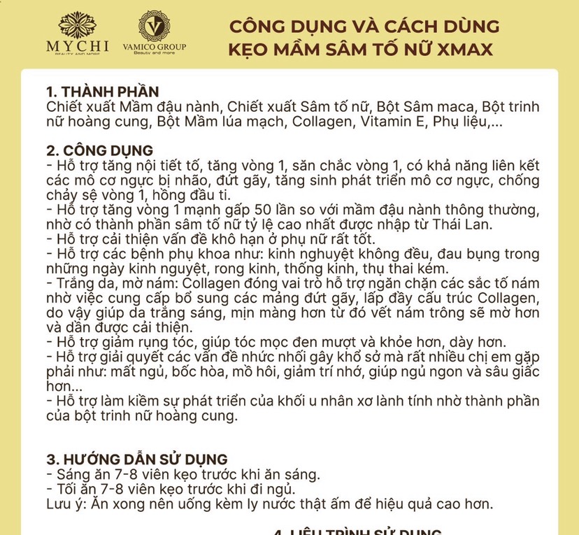KẸO MẦM SÂM TỐ NỮ XMAX MYCHI 1. CÔNG DỤNG - Tăng nội tiết tố, tăng vòng 1, săn chắc vòng 1, có khả năng liên kết các mô cơ ngực bị nhão, đứt gãy,
