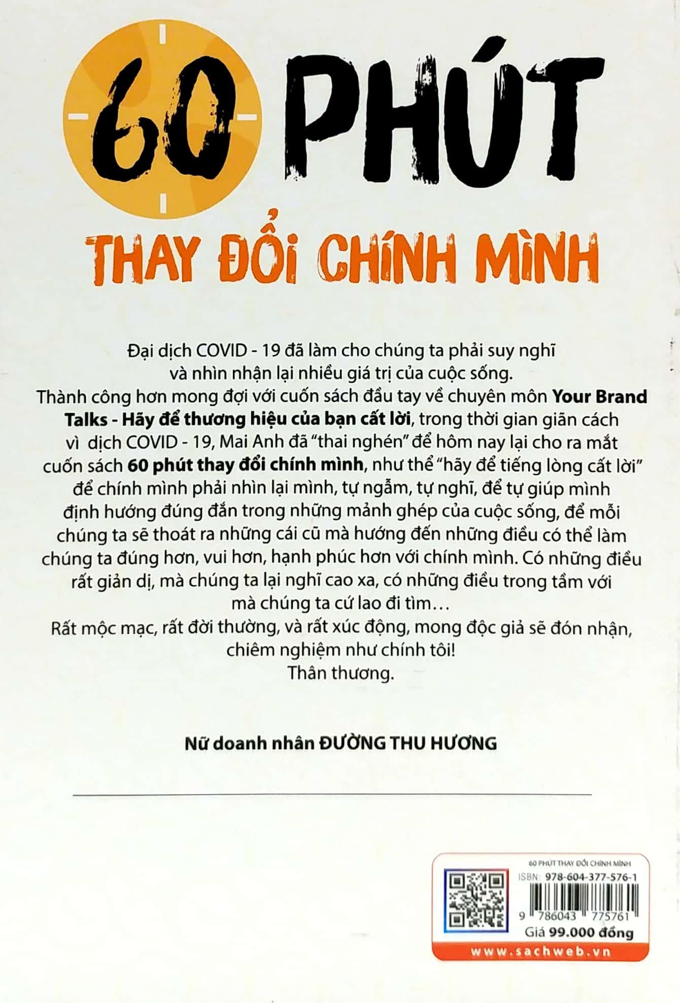 Mua tại Tiktok60 Phút Thay Đổi Chính Mình "Hành trình nào rồi cũng sẽ có đích đến, dù viên mãn hay không nhưng ít nhất, chúng ta đã luôn cố gắng từng phút giây, vì thời gian không bao giờ có thể quay trở lại. Thế nên chọn mà đi, là hành trình chọn cho mình mà không phải chọn vì người khá". - Lê Mai Anh 60 phút thay đổi chính mình - Những chia sẻ truyền cảm hứng giúp bạn trẻ tốt hơn mỗi ngày - Tác giả: Lê Mai Anh