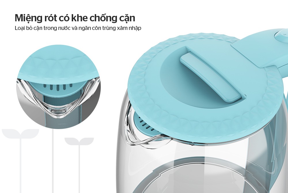 - Miệng rót tích hợp khe chống cặn Với khe chống cặn tích hợp ngay ở nắp ấm, khi bạn rót nước từ trong ấm siêu tốc thủy tinh 1.8 L SUNHOUSE SHD1370 ra bình/cốc, các loại cặn sẽ được ngăn lại. Đồng thời các loại côn trùng như muỗi, kiến, bọ… cũng sẽ không thể lọt vào ấm.