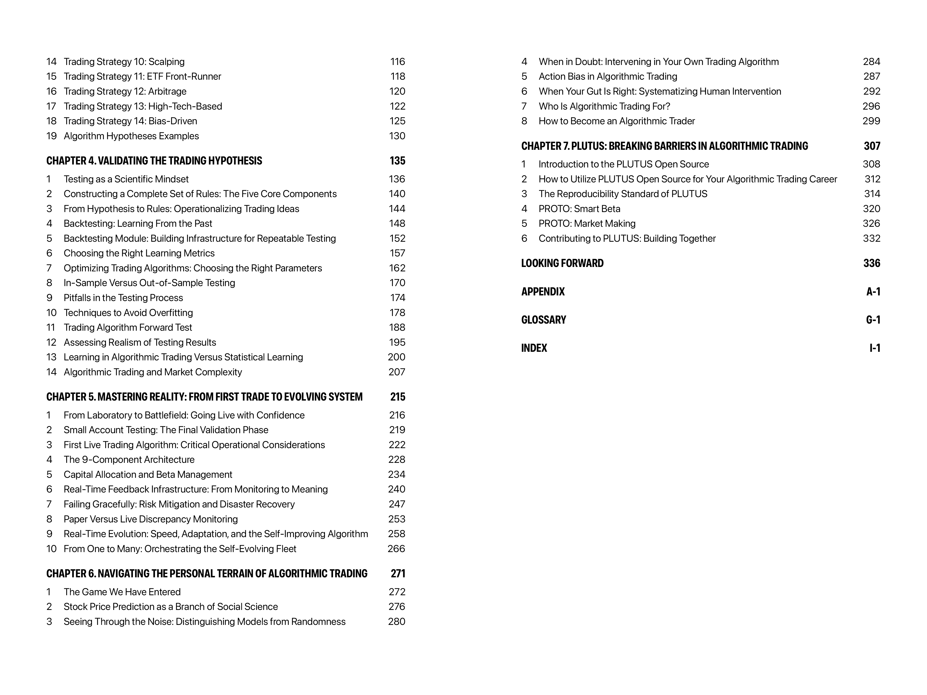 Whether you are an individual investor, a hedge fund manager, a financial advisor, or a quantitative trader, everyone who participates in the financial markets faces a universal challenge: making investment decisions - what to buy or sell and when to act. But how do we make those decisions? Are they driven by instinct, emotion, a blend of technical indicators, macroeconomic analysis, broker reports, intrinsic value calculations, or even complex mathematical models? Regardless of the method, one thing is clear: when we act, we do so with a belief, the belief that our decision will lead to a favorable outcome. At the very least, we hope it will yield a meaningful return. And yet, after thousands of trades and countless hours of testing, many begin to ask an insightful question: Are our decisions truly based on substance, or are we simply making arbitrary guesses wrapped in sophistication? At ALGOTRADE, we faced the same doubts for years. But instead of relying on intuition, we turned to science. We asked: Can we improve the accuracy of investment decisions for future performance through structured, data-driven methods? Surprising? Perhaps. But yes, we mean what we say: future, not past. After numerous iterations and no shortage of costly mistakes, we found it possible. By applying techniques from data science and statistical modeling, we discovered that certain investment strategies can indeed produce consistent profits under forward-looking conditions. But this insight led to a second, even more ambitious question: If we can verify a strategy's effectiveness, can we automate the entire investment process, like building a self-driving car for trading? Again, the answer was yes. This book is the result of that journey. We attempt to distill and share the essential knowledge and practical experience we have gained, centered around four core pillars: 1 How to form a trading hypothesis, based on measurable edges and clear prerequisites, to increase your probability of success. 2 How to verify the potential of a trading strategy with a high degree of statistical confidence. 3 How to fully automate the execution of a strategy in real-world markets. 4 How to implement these concepts using PLUTUS, the open-source algorithmic trading framework developed by us, including real examples we have built and refined, so that you can apply them directly. We wrote this book not just to share what we have learned, but to invite you into the process. We hope it will challenge your thinking, improve your systems, and help you develop an algorithmic trading mindset grounded in logic, data, and reproducibility. Above all, we look forward to hearing from you, your feedback, your ideas, and your experiences. The ALGOTRADE Team