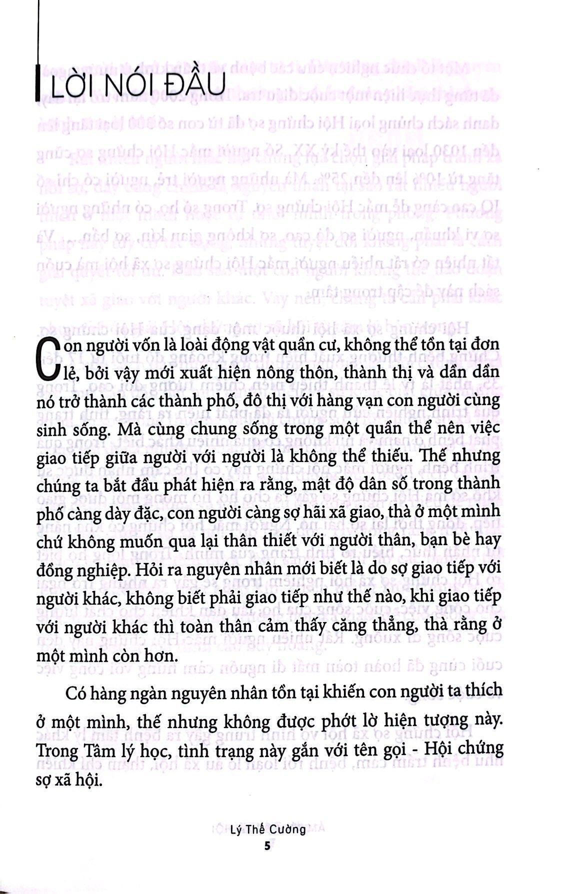 Cuốn sách sẽ mang đến cho bạn những cái nhìn tổng quát, kết hợp lý thuyết với thực tế, phân tích sự khác biệt giữa lo âu, lo sợ thông thường với “Hội chứng sợ”. Hy vọng mọi thắc mắc của bạn có thể được làm sáng tỏ. Từ đó, các bạn có thể sẵn sàng bước ra khỏi bức màn khép kín, thành thạo mọi trường hợp xã giao, để cuộc sống bước lên đỉnh cao huy hoàng!