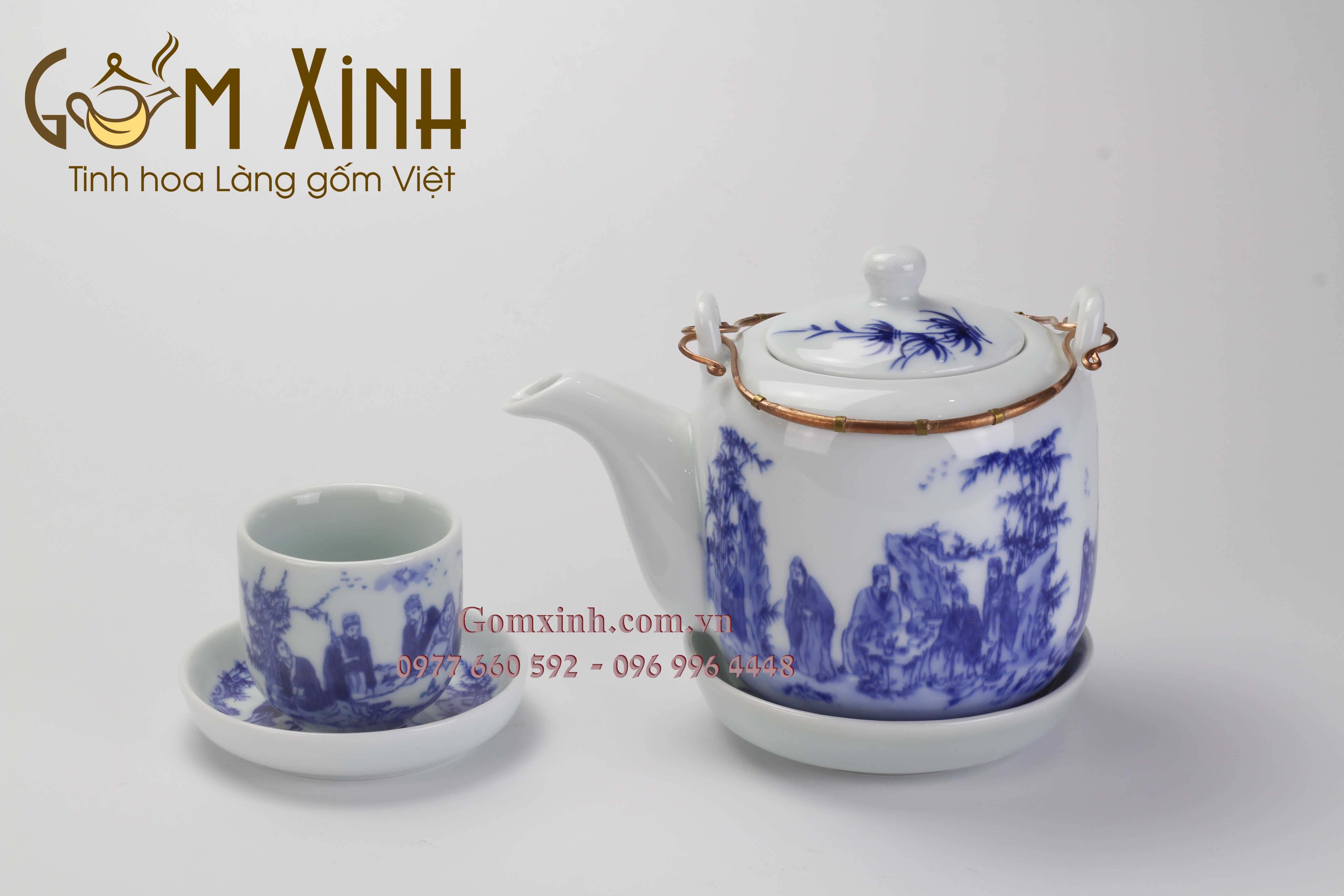 Bộ ấm chén men lam cổ Bát Tràng vẽ Trúc lâm thất hiền được làm thủ công tại làng nghề Bát Tràng.