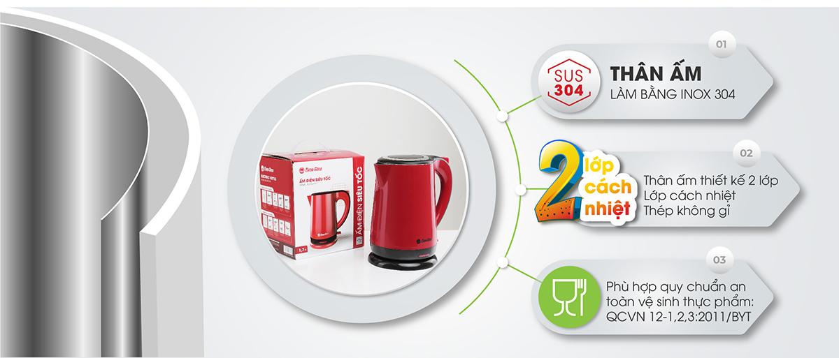 - Có bộ phận bảo vệ chống rò điện, quá nóng và chống cạn nước Thông số kĩ thuật: Dung tích 1,7 lít Công suất 1,500W Điện áp 220V Tần số danh định 50hz Hệ thống quản lý chất lượng ISO 9001:2015 Tiêu chuẩn áp dụng TCVN 5699-2-15:2013/IEC 60335-2-15:2012 TCCS 36:2020/RĐ Quy chuẩn vệ sinh ATTP QCVN 12-1,2,3:2011/BYT