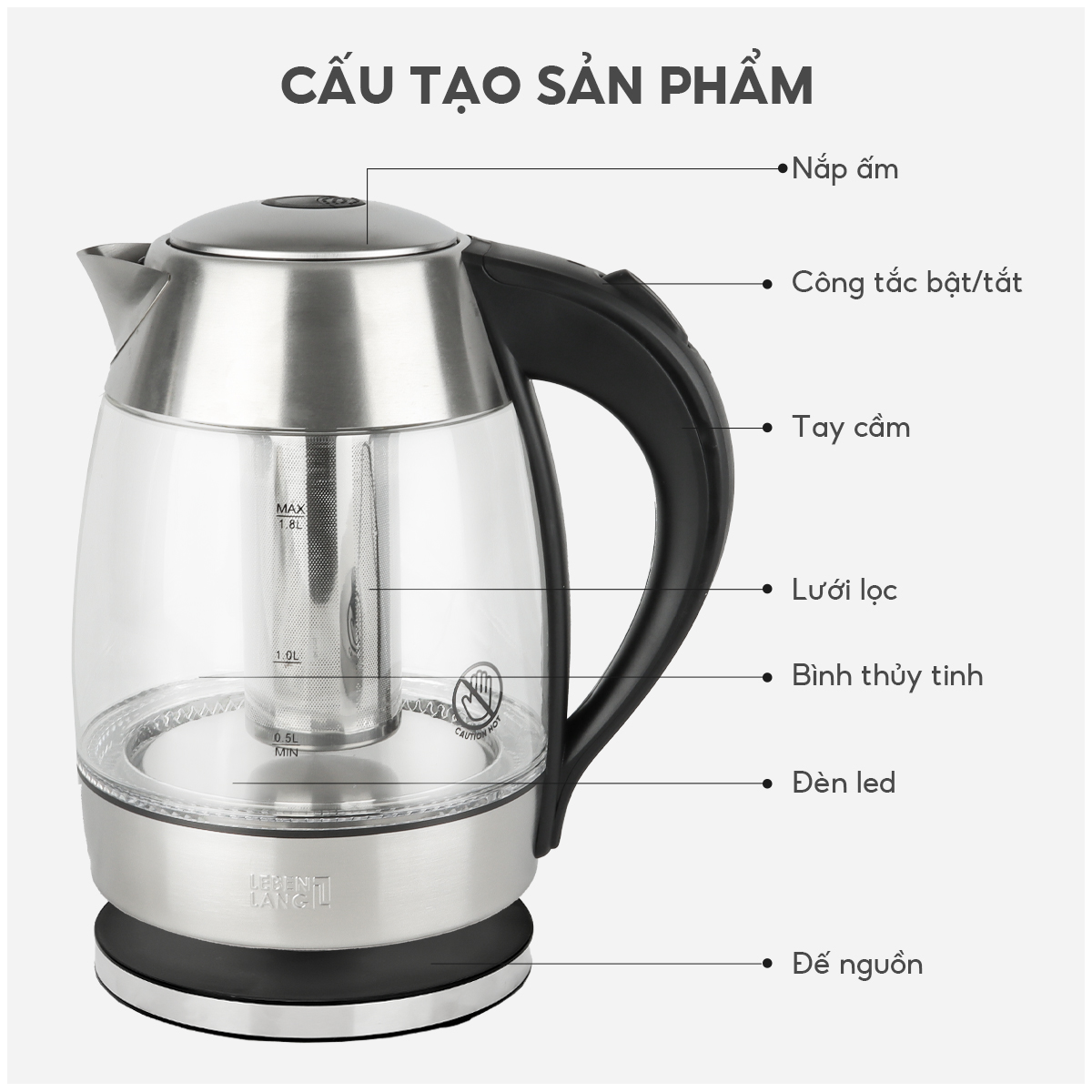 Ấm siêu tốc LEBENLANG LBL2879 bằng thủy tinh chịu nhiệt - hành chính hãng - Dung tích: 1.7L - Công suất: 1850W-2200W - Chất liệu: Thủy tinh, Inox, nhựa PP cao cấp. Không