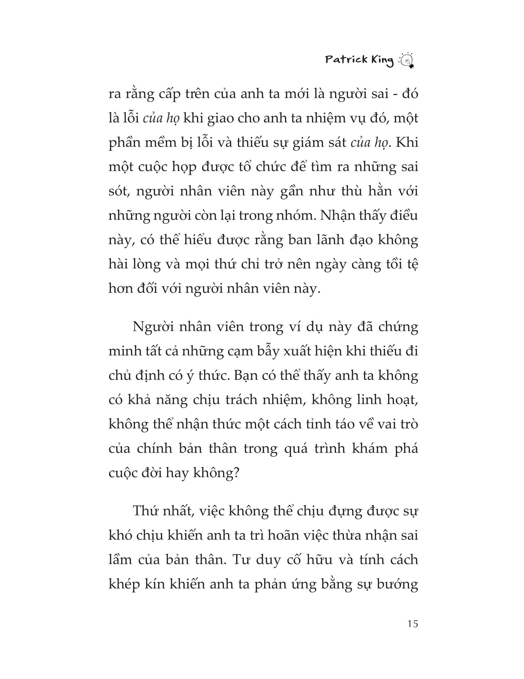 Suy nghĩ có chủ đích sẽ dễ hiểu hơn khi chúng ta xem xét những khía cạnh không nói lên đặc trưng của nó. Khi không có chủ đích, chúng ta hành động theo những cách mang tính đối phó và thụ động, tức là dựa trên “chế độ tự động”. Chúng ta quay cuồng theo ý thích này hay ý thích khác, chạy theo mọi sự phân tâm ngẫu nhiên, không bao giờ thực sự nhận thức được công việc bản thân đang thực hiện, ngoài việc giống như một chiếc lá đang bay trong gió. Hay tệ hơn, chúng ta phụ thuộc vào nỗi sợ hãi và điểm yếu của bản thân, hoặc mù quáng đi theo cách nhìn của người khác về cuộc sống của chính chúng ta.