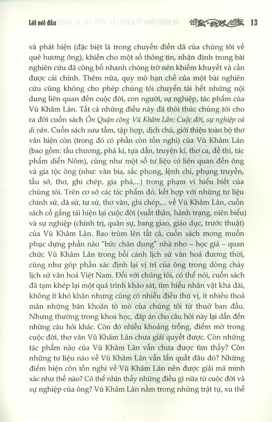 Ôn Quận công Vũ Khâm Lân: Cuộc đời, sự nghiệp và di văn là công trình công bố đầy đủ nhất những tư liệu nguyên cấp liên quan đến Vũ Khâm Lân, trong đó có nhiều tư liệu quý còn ít được biết đến. Các tư liệu được giải mã, chuyển ngữ với nỗ lực cao nhất. Đồng thời, từ việc “đọc sâu”, đọc liên văn bản, cuốn sách tái dựng được tương đối rõ nét “bức chân dung” nhà nho – học giả – quan chức Vũ Khâm Lân, cũng như tái định vị được phần nào vị trí của ông trong “bức tranh” Đại Việt thế kỉ XVIII nói riêng và trong lịch sử văn hoá Việt Nam nói chung.