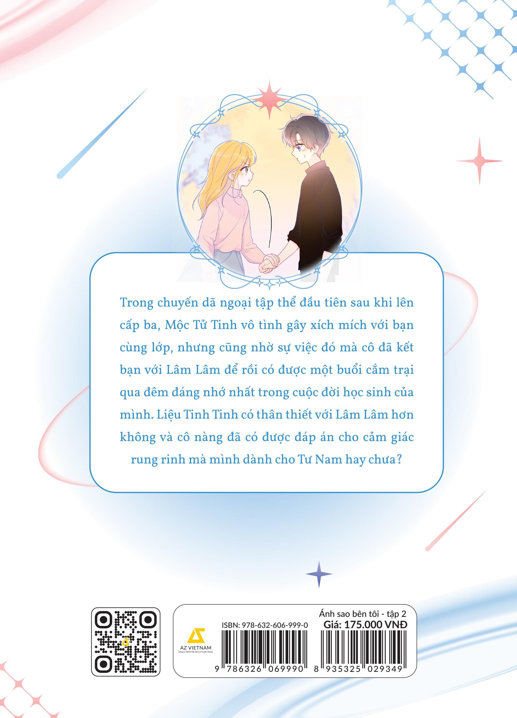 Giới thiệu sách: Tư Nam và Tử Tinh – đôi bạn thân từ nhỏ trở nên gắn bó khi mẹ Tư Nam thường xuyên đi làm vắng nhà. Những lúc không có mẹ ở cạnh, cậu bạn lạnh lùng Tư Nam luôn có cô nhóc lắm lời, tinh nghịch Tinh Tinh ở bên, như tia nắng nhỏ xua tan mọi cô đơn Thời gian trôi qua, cả hai đã lên cấp ba và chuẩn bị tham gia chuyến dã ngoại tập thể cùng lớp. Mộc Tử Tinh với cái tính thẳng như ruột ngựa – vô tình gây xích mích với bạn cùng lớp, nhưng ai ngờ lại nhờ đó mà làm quen với Lâm Lâm – cô bạn nhút nhát đáng yêu. Một nhóm bạn mới dần được hình thành, khiến chuyến dã ngoại lần này vui nhộn hơn bao giờ hết! Không chỉ là chuyện tình gà bông dễ thương, ÁNH SAO BÊN TÔI còn là tấm vé quay về thanh xuân rực rỡ với tình bạn trong sáng, cùng những rung động đầu đời chưa biết gọi tên!