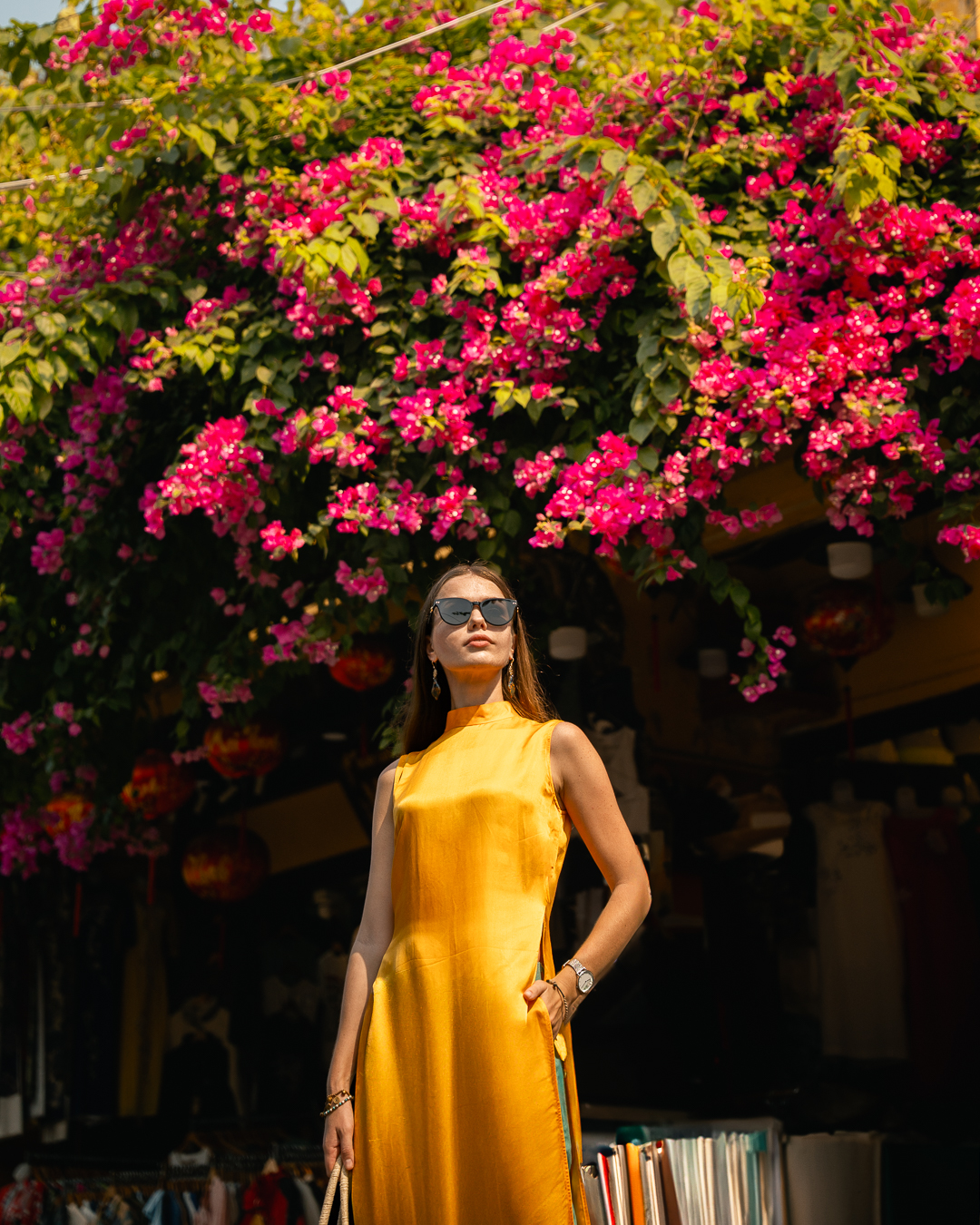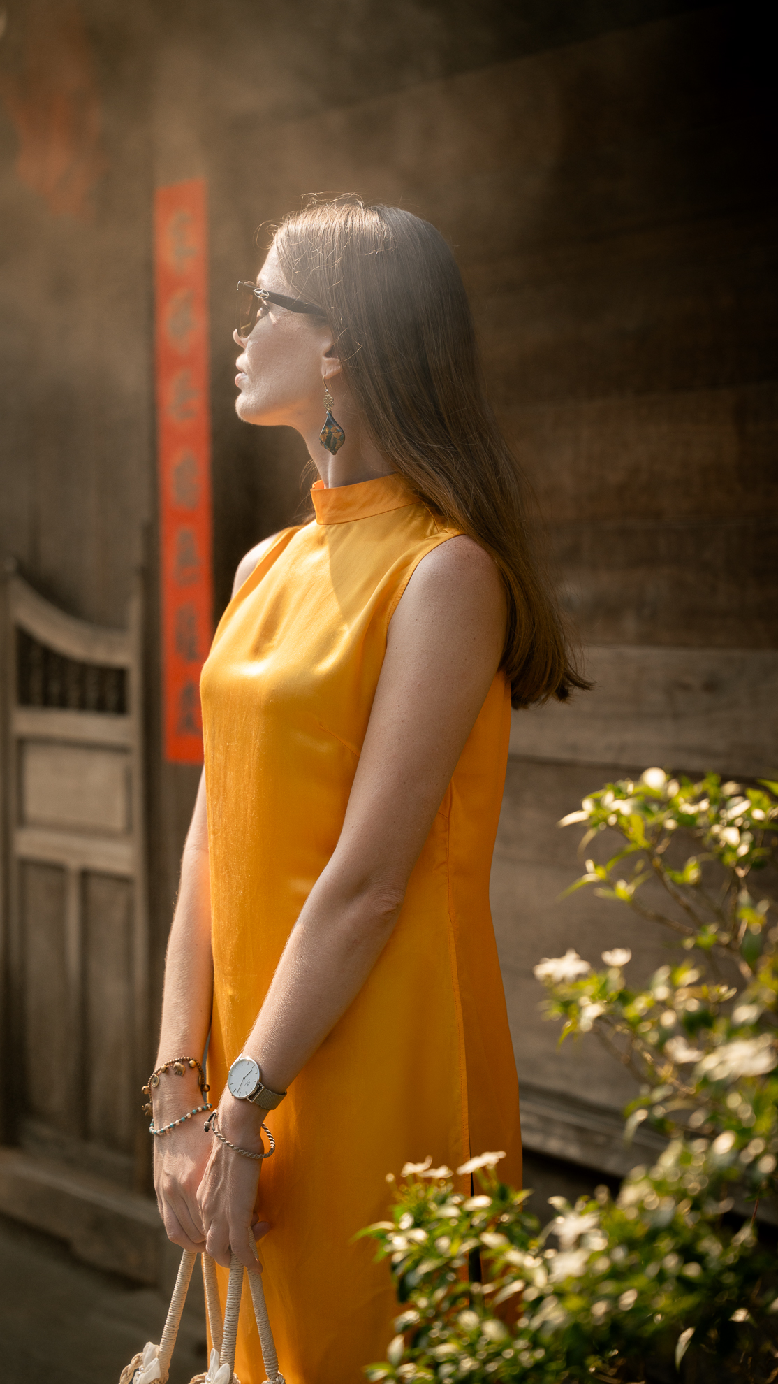Tấm áo dài cách tân mang sắc màu óng ả nắng vàng lấy cảm hứng từ sắc hoa mùa thu nhiệt đới dã quỳ – loài hoa nổi bật với sắc vàng rực rỡ, phủ kín các sườn đồi cao nguyên. Với tinh thần luôn hướng về cảm xúc giao thoa giữa truyền thống và hiện đại, tấm áo dài Dã Quỳ được Hity thiết kế theo phong cách tối giản, không quá cầu kỳ nhưng vẫn giữ được vẻ đẹp tinh tế, tôn lên sự duyên dáng của người phụ nữ. Màu vàng nổi bật từ hoa dã quỳ tạo nên vẻ đẹp tự nhiên, tươi mới, mang đậm dấu ấn của mùa thu vùng nhiệt đới. Những chi tiết nhỏ như đường viền cổ áo, những đường cắt may khéo léo tạo nên nét chấm phá riêng, vừa giữ được vẻ cổ điển của áo dài truyền thống vừa thêm nét trẻ trung hiện đại. Chất liệu lụa tơ tằm được dệt từ làng lụa đũi Nam Cao, Thái Bình mềm mại, nhẹ nhàng và mát mẻ, giúp người mặc cảm nhận từng hơi thở đất trời thật nhẹ nhàng thanh cao. Áo dài kiểu dáng suông cách tân không tay Cổ cao 3.5cm Chích ben ngực và ben lưng Cài bằng dây khoá kéo sau lưng CHẤT LIỆU Lụa tơ tằm 100%, sợi tơ tằm tự nhiên Việt Nam Sản phẩm vải của HTX Làng nghề Lụa đũi Nam Cao Thái Bình với 100% từ tơ tằm tự nhiên đạt những tiêu chuẩn cao Dệt máy Khổ vải: 90cm Nghệ nhân: Ninh Trung Cắt may thủ công tinh tế tại Hity Atelier Nha Trang, Việt Nam Hướng dẫn sử dụng: Tránh ánh nắng mặt trời: Không phơi lụa tơ tằm dưới ánh nắng trực tiếp vì có thể làm vải bị phai màu và giảm độ bền của sợi. Giữ khô ráo: Không để lụa tiếp xúc lâu với nước hay các chất lỏng có thể gây ra các vết bẩn khó giặt. Không dùng nước hoa hay xịt khử mùi trực tiếp: Các chất hóa học trong nước hoa hay xịt khử mùi có thể làm hỏng sợi lụa và tạo vết ố. Cách giặt: Giặt bằng tay hoặc giặt hấp. Đổ đầy nước lạnh 24 - 35 độ C vào chậu hoặc bồn rửa. Thêm 5ml dầu gội hoặc xà bông dịu nhẹ, không chất tẩy vào chậu hoặc bồn rửa, khuấy đều cho nước lên bọt. Nhúng ngập đồ lụa vào bồn rửa, khuấy nhẹ để đồ lụa ngấm nước từ từ. bạn có thể ngâm đồ lụa từ 3-4 phút, sau đó vò nhẹ bằng tay. Xả 3 đến 4 lần nước lạnh làm sạch, sau đó nhấc đồ tơ tằm ra và giũ nước. Không vắt sẽ làm đồ lụa bị nhăn. Không vò hay vắt mạnh: Khi giặt, nhẹ nhàng bóp nhẹ để làm sạch và xả lại bằng nước sạch. Không vò hay vắt mạnh vì có thể làm hỏng cấu trúc của sợi. Không sử dụng nước tẩy / thuốc tẩy Sử dụng dấm hoặc chanh: Khi xả, có thể thêm một chút dấm hoặc nước chanh vào nước xả cuối để giữ cho lụa mềm mại và sáng bóng. Chỉ giặt riêng từng sản phẩm để tránh các sản phẩm loang màu sang nhau. Cách làm khô Phơi khô trên bề mặt phẳng, nơi thoáng gió, dưới bóng râm, tránh phơi trực tiêp dưới ánh nắng sẽ làm lụa khô, yếu sợi và phai màu. Không sử dụng máy sấy có thể làm co và làm hỏng cấu trúc của lụa. Cách ủi (là) Ủi ở nhiệt độ tối đa 110ºC (Chế độ Lụa Silk) Ủi bằng bàn ủi hơi nước Ủi mặt trái: Đặt một lớp vải mỏng lên trên lụa và là từ mặt trái để tránh làm bóng vải Lụa nên khô hoàn toàn trước khi ủi để tránh hiện tượng co rút. Bảo quản