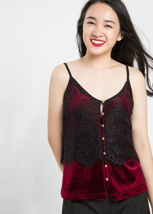 - kiểu áo hai dây mảnh - cup ngực ngang, nhấn lớp ren trên cup ngực - hai dây qua vai, dây crossback phía sau - lai xẻ - không lót trong - chất liệu