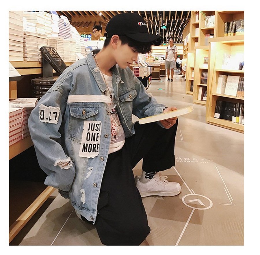 Áo khoác jeans xanh rách Uniex Just One More cực chất Chất Liệu: Vải Jean xịn mặc mát, form đẹp Size : S, M, L, XL, XXl Áo khoác jean form rộng Unisex nam nữ