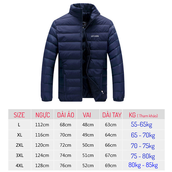 Áo Khoác Phao Cao Cấp Tên SP: ÁO KHOÁC PHAO NAM CHẦN BÔNG 3 LỚP CAO CẤP MÀU SẮC: Xanh đen, đỏ, trắng kem KÍCH THƯỚC: Size : M 45kg - 60kg , L 60kg