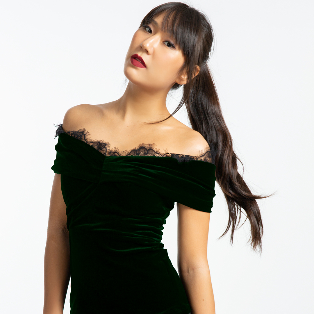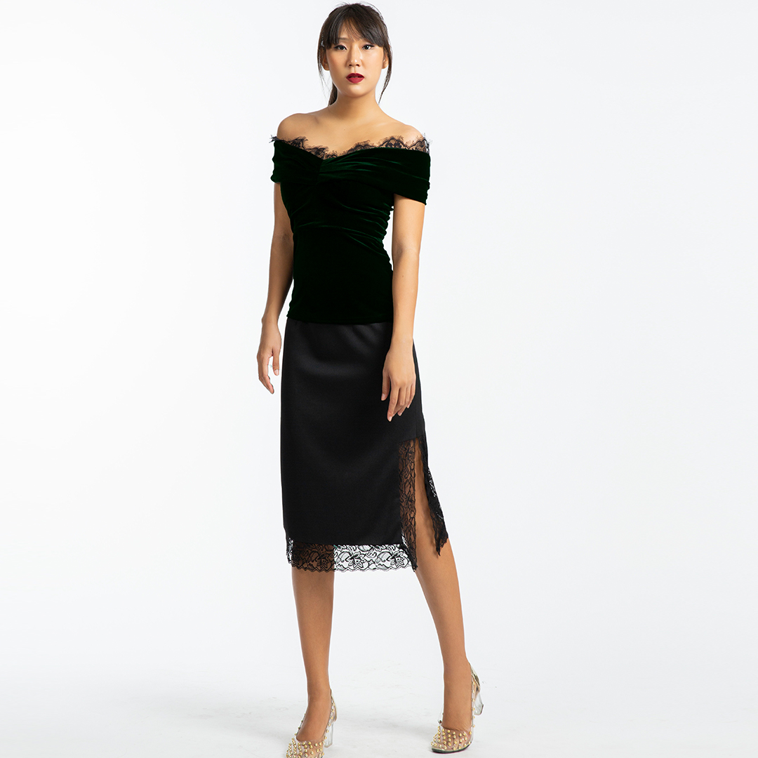 Áo trễ vai nhung được làm chất liệu nhung ép phối sợi kim tuyến pha giữa polyester, spandex nên có sợi vải mềm mại, mặt trong mềm mát, mặt ngoài mịn màng, có độ xốp và bóng nhẹ sờ vào rất mát tay. Độ co giãn của áo chính là điểm mạnh mang lại sự thoải mái tuyệt vời cho người mặc. Chẳng những thế, Hity còn cẩn thận đặt thêm chiếc dây khóa kéo bên hông để giúp chiếc áo ôm trọn sát người khoe hai vòng sexy mà vẫn dễ mặc. Phần thiết kế vai trễ duyên dáng để lộ phần xương quai thanh mảnh, gợi cảm.