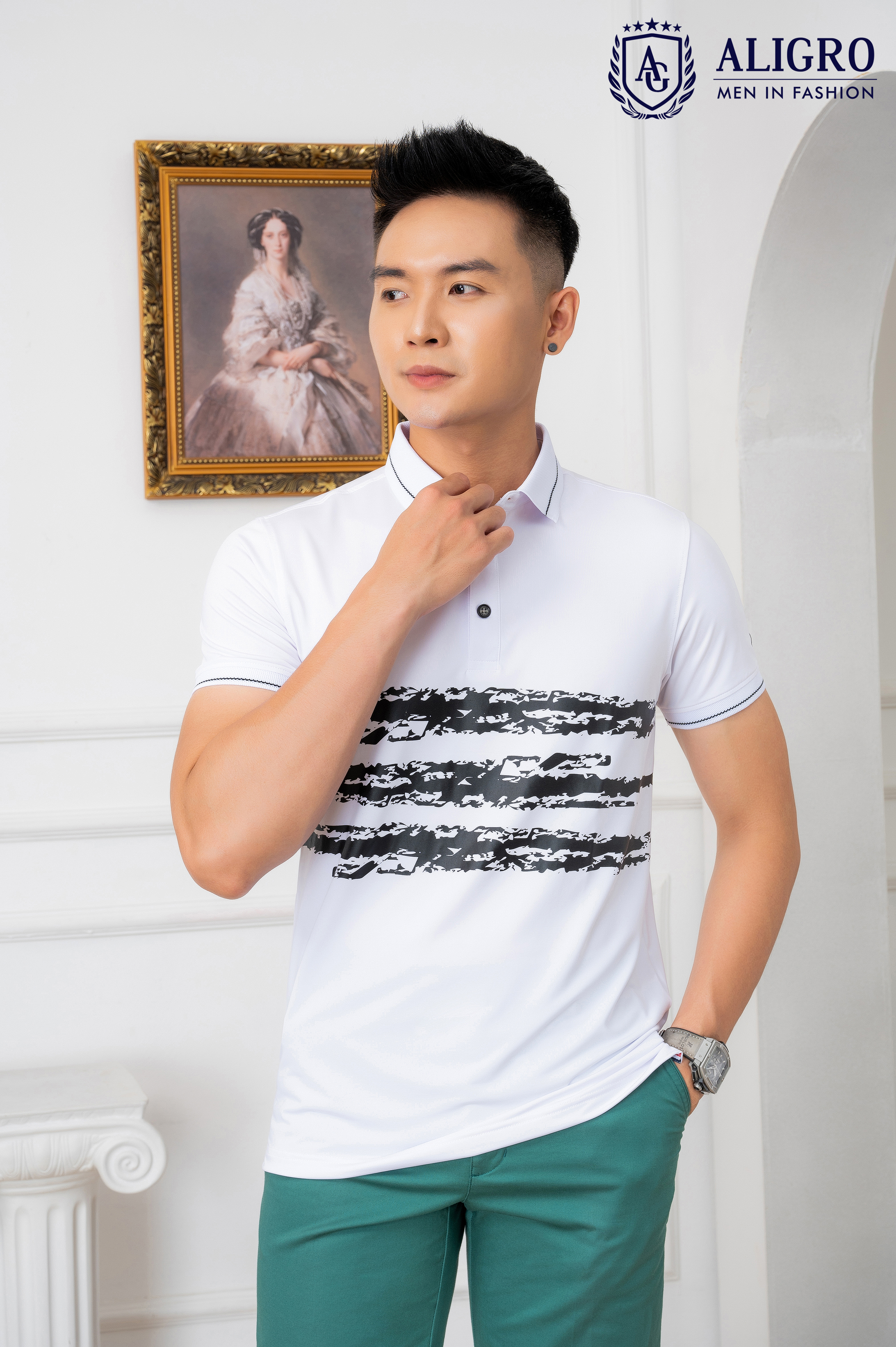 ✨Áo Polo trắng phối kẻ ngang Aligro ALGPLO70