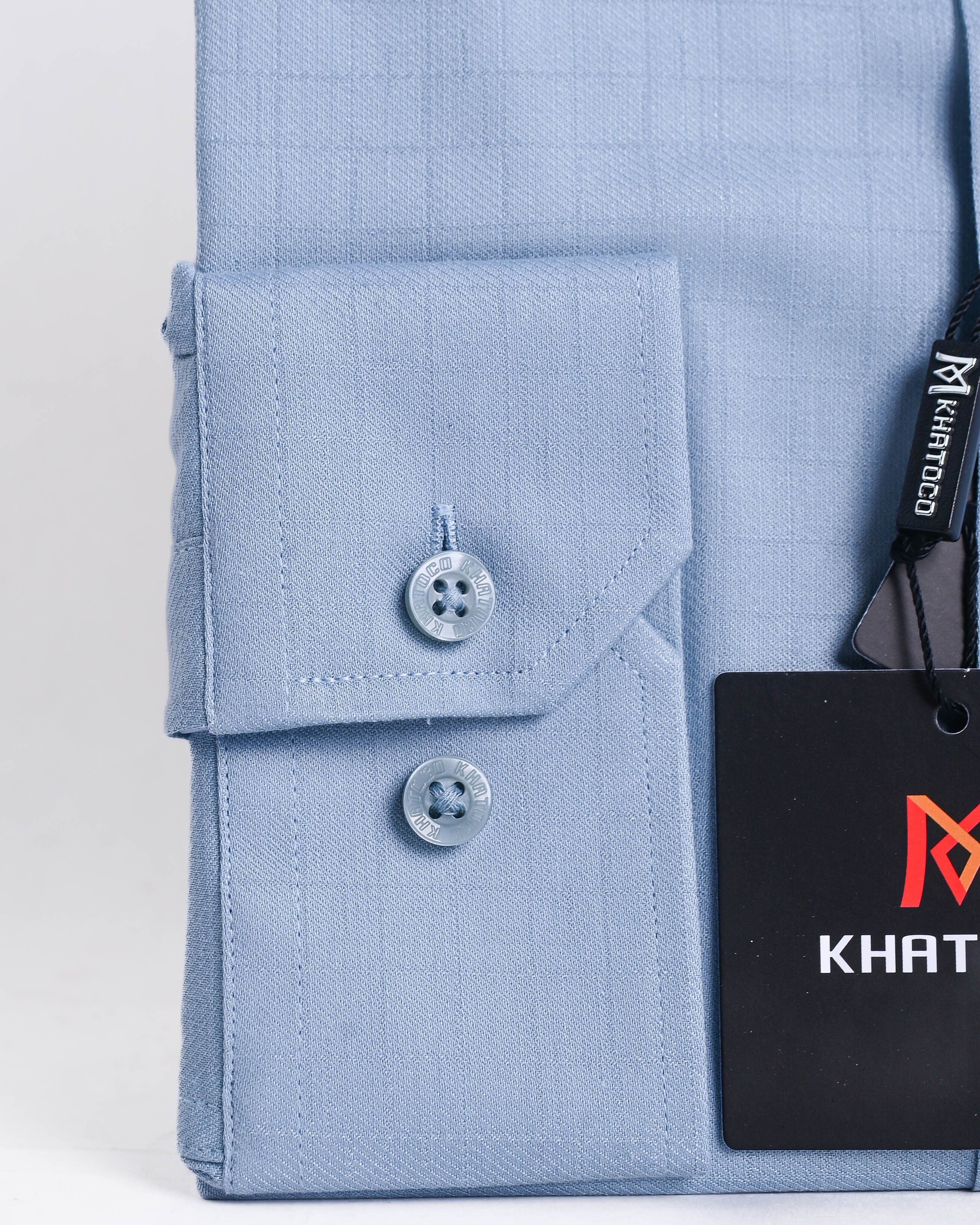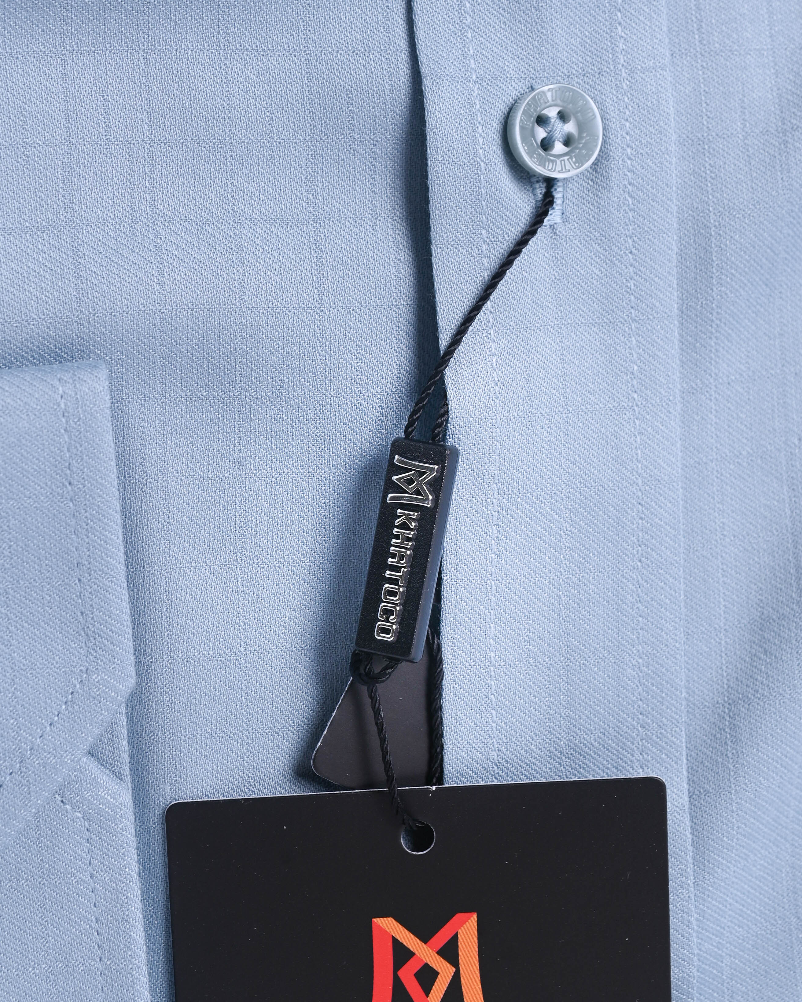Thiết kế: Màu xanh trang nhã, họa tiết dệt chìm tinh tế, cổ bẻ cổ điển, tay dài lịch sự, phù hợp với nhiều phong cách phối đồ.