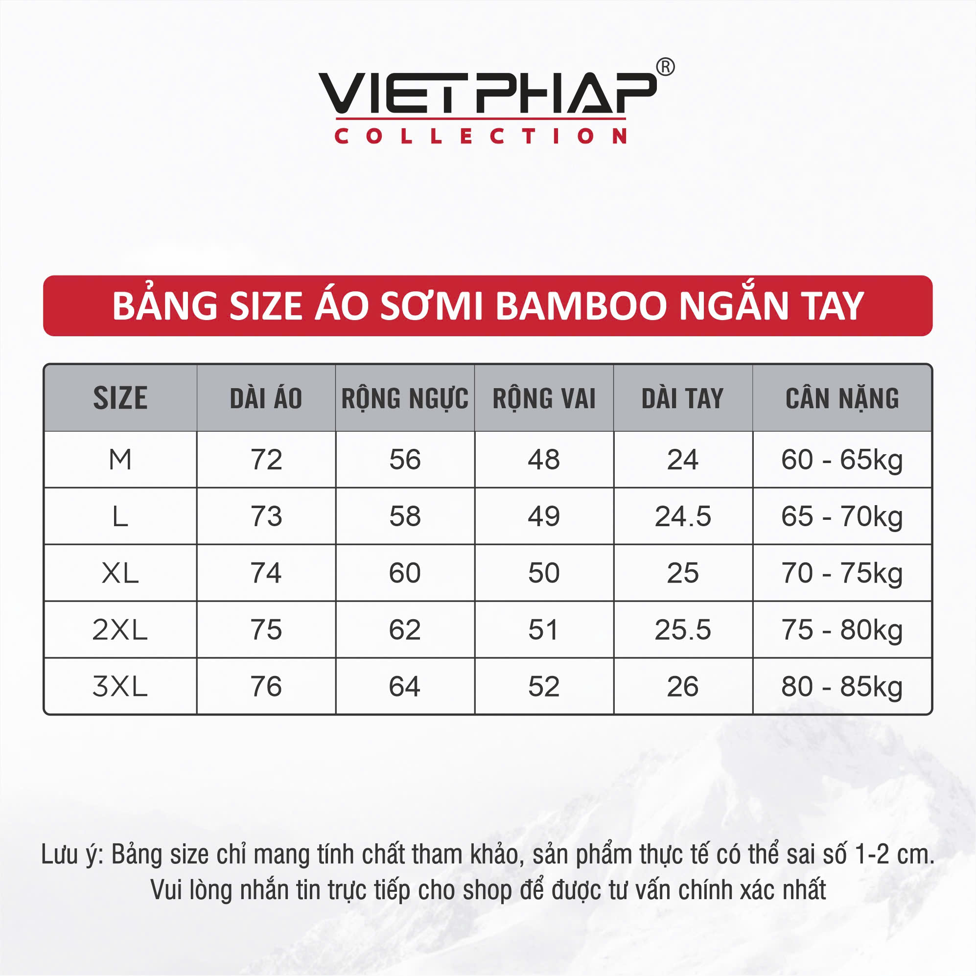 - Đổi trả hàng theo đúng quy định của Tiki VietPhap Collection Sản xuất tại: CTY TNHH May Mặc – Thời Trang Việt Pháp Cùng bạn làm nên phong cách! LƯU Ý: - Bảng size chart chỉ mang tính chất tham khảo, tùy thuộc vào số đo cơ thể mỗi người và chất liệu vải khác nhau sẽ có sự chênh lệch nhất định từ 1 - 2cm.