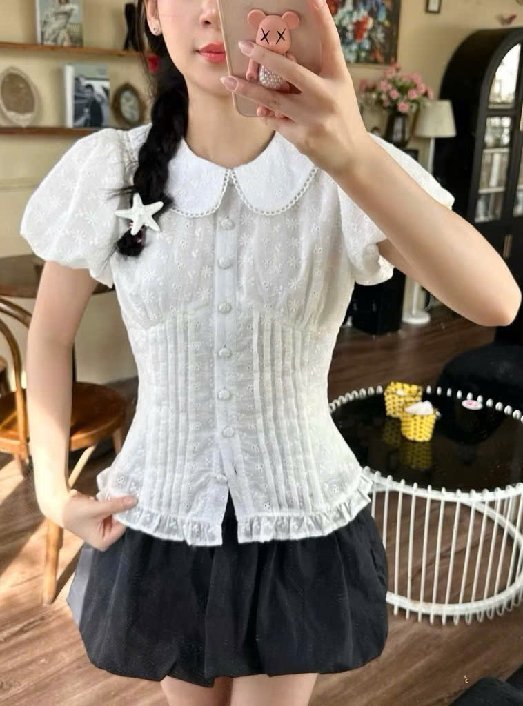 CHI TIẾT SẢN PHẨM - Sản phẩm : Áo sơ mi kiểu tay phồng dễ thương nữ tính thích hợp công sở Garnet Miều Est.2013 - Chất liệu : Xô Ren - Màu sắc :