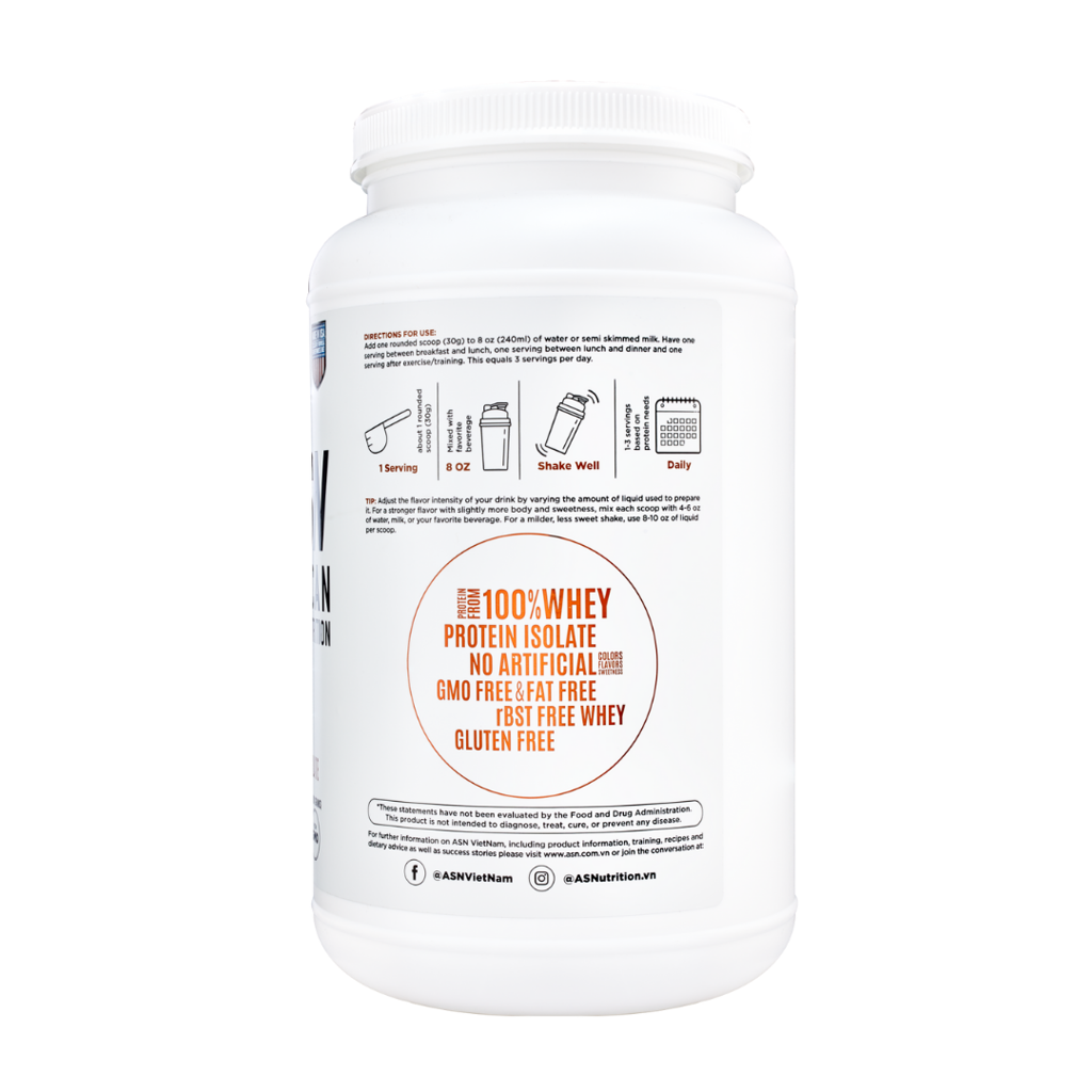 ASN 100% WHEY PROTEIN ISOLATE - VỊ DOUBLE CHOCOLATE - 100% BỘT WHEY PROTEIN ISOLATE TINH KHIẾT. - 100% Nguyên liệu không biến đổi Gen (Non-GMO). - KHÔNG chất tạo màu, vị, ngọt nhân