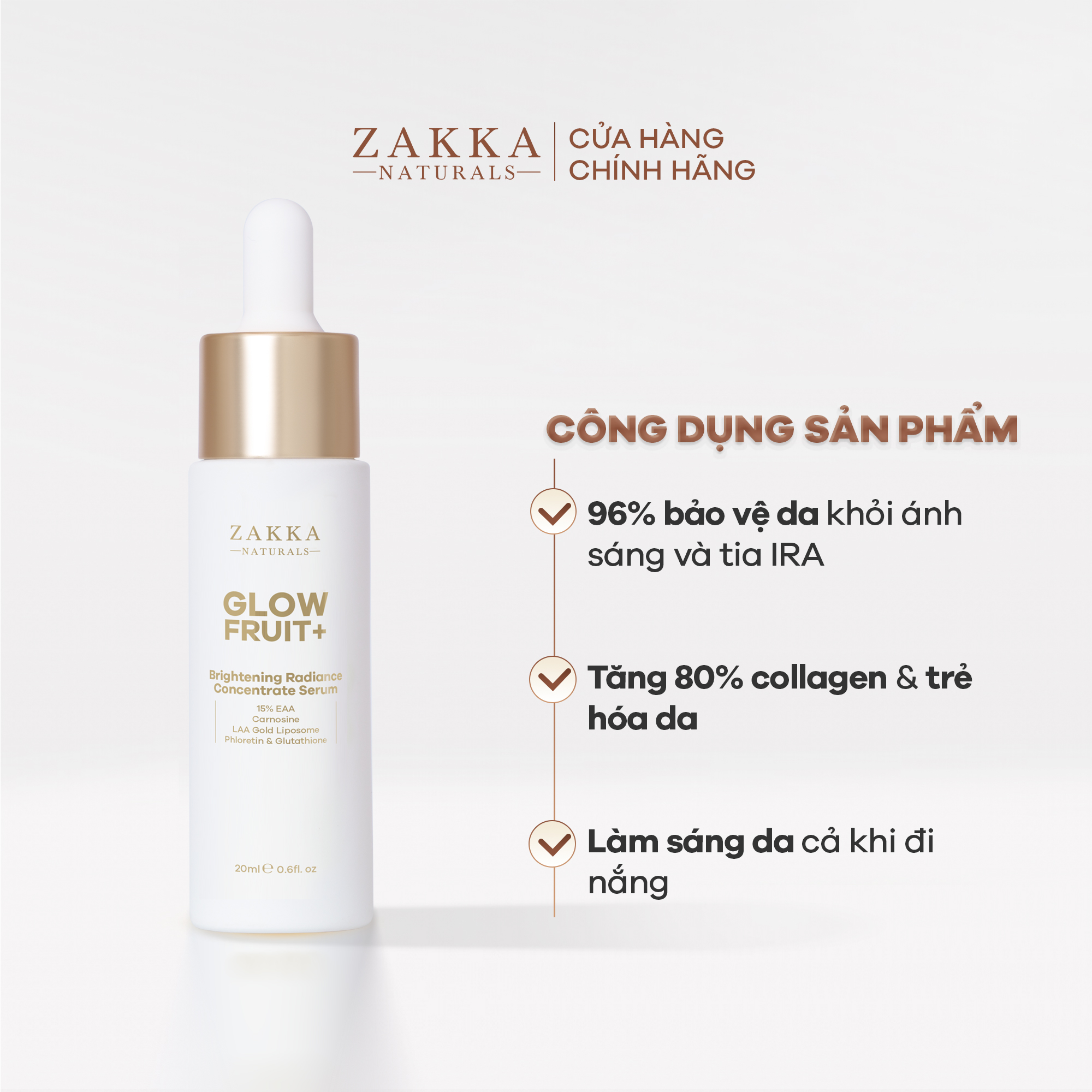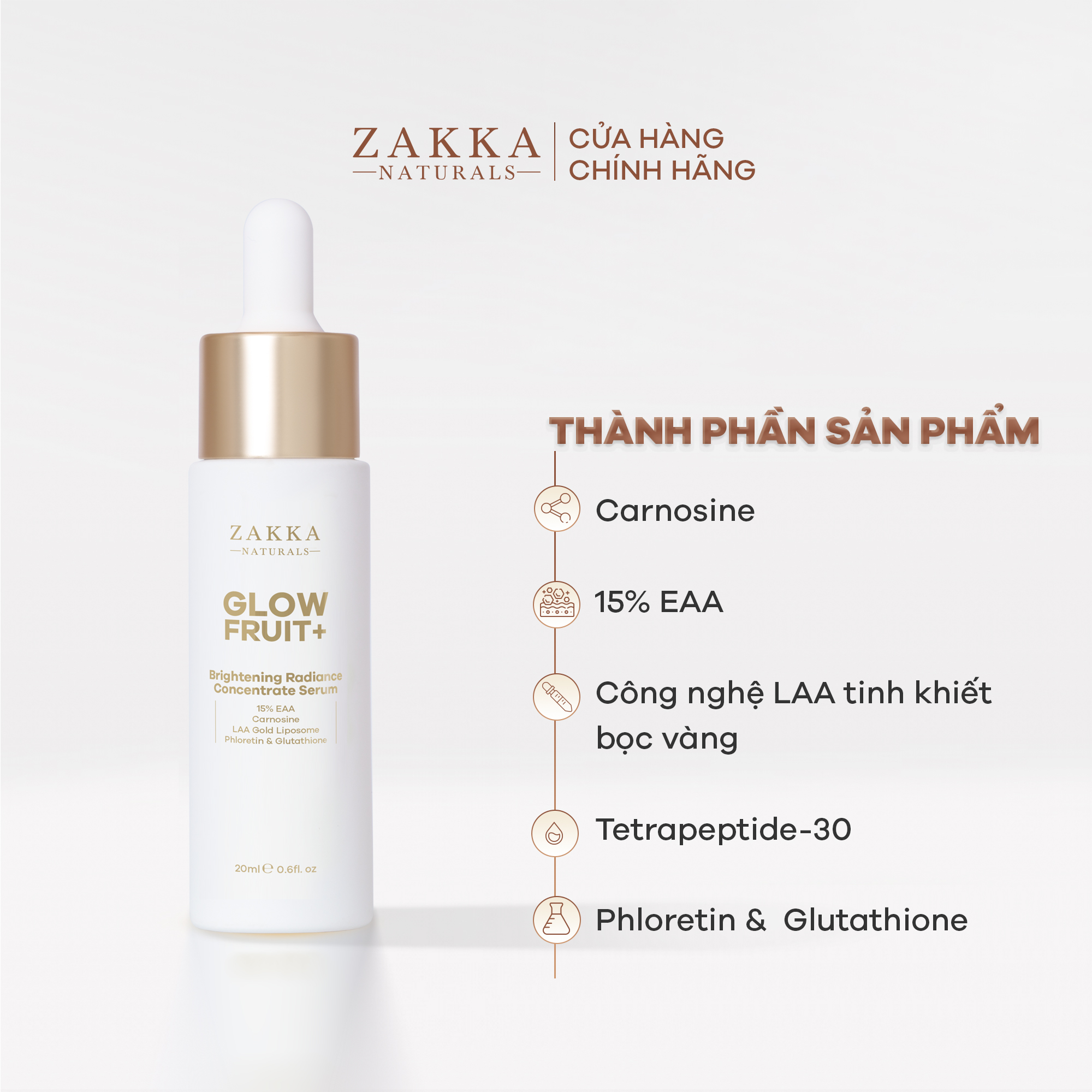 Serum (Tinh Chất) Vitamin C Zakka Naturals GlowFruit+ Brightening với công thức tiên phong gồm Carnosine - Hoạt chất chống đường hóa (Anti Glycation) giúp giảm sắc vàng trên da, chống lão hóa và bảo vệ làn da khỏi tác động của các loại ánh sáng (tia UVs, IR và ánh sáng khả kiến). Đồng thời, sản phẩm còn chứa tổ hợp chống oxy hóa mạnh mẽ giúp trung hòa gốc tự do gây hại cho da, bao gồm: 15% 3-O-Ethyl Ascorbic Acid, Phloretin, từ táo xanh cùng công nghệ L-Ascorbic Acid tinh khiết bọc vàng giúp tăng khả năng thẩm thấu đến 2,5 lần và xác định đúng vị trí cần sửa chữa.