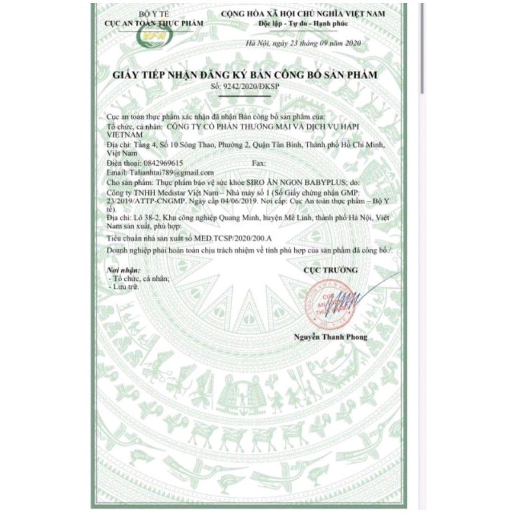Đảm Bảo Chính Hãng : Siro Ăn Ngon BABYPLUS - Giúp Bé Tăng Cân, Tiêu Hoá Tốt, Tăng Cường Đề Kháng, Hết Táo Bón Đối tượng sử dụng: Trẻ em tiêu hóa kém, chậm hấp
