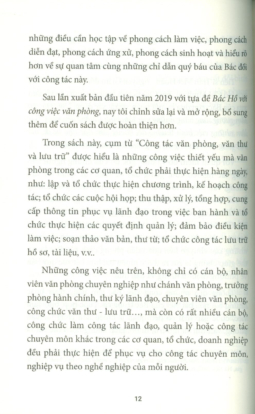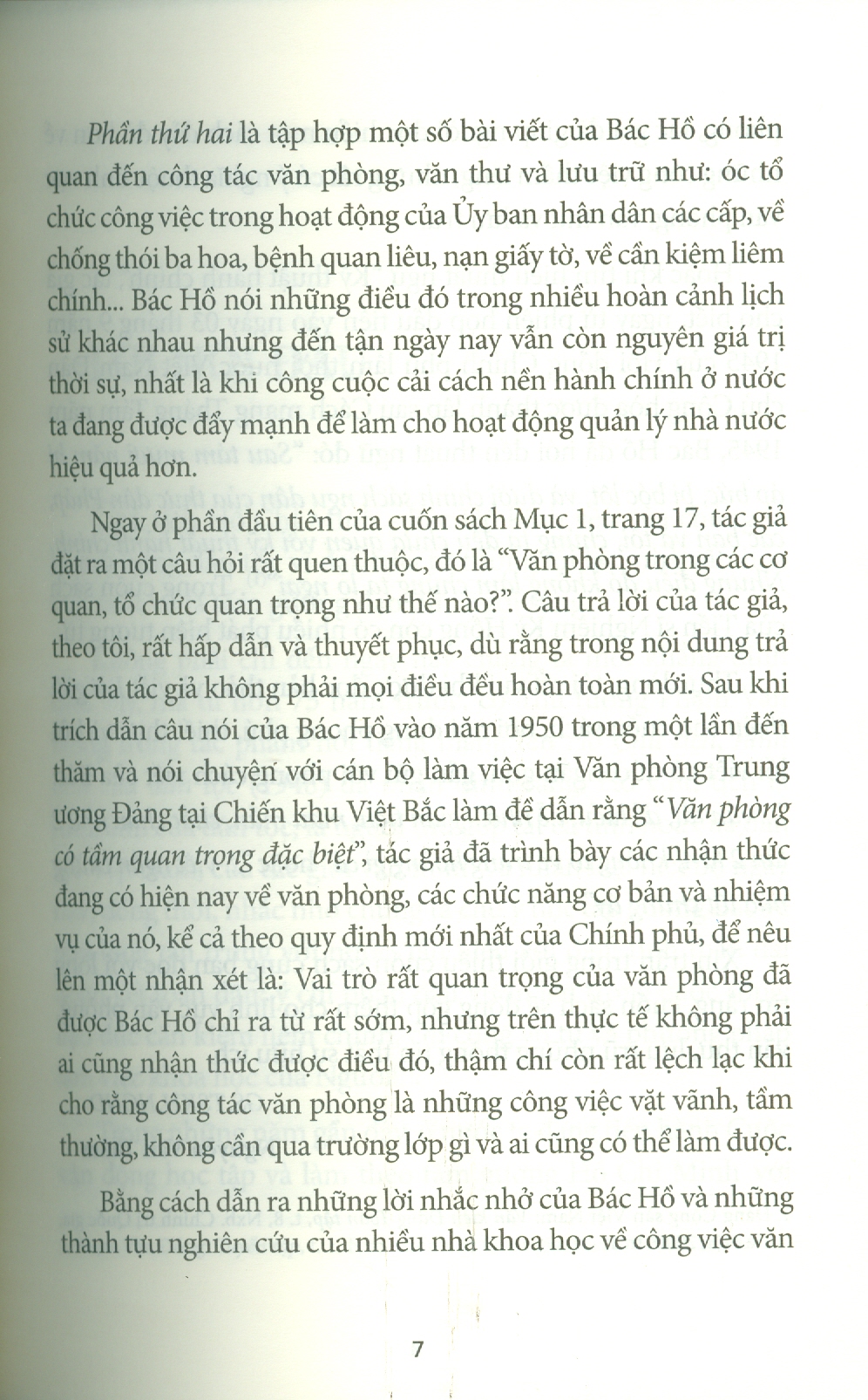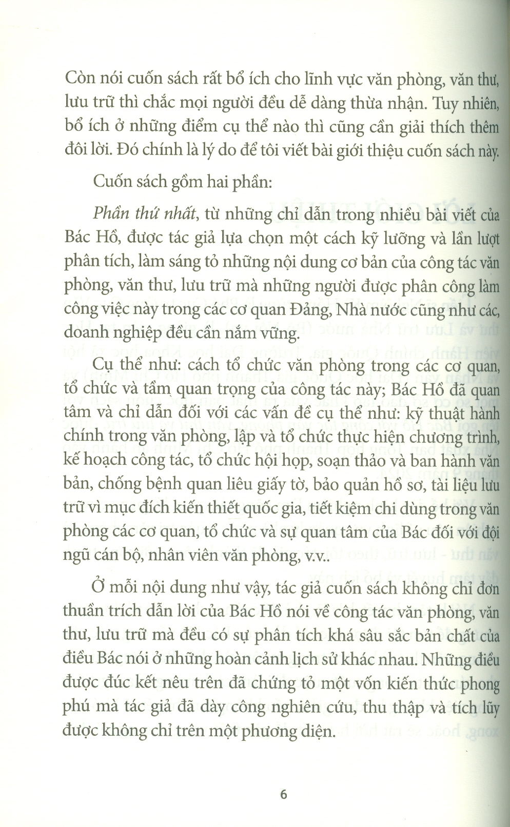 Phần thứ hai là tập hợp một số bài viết của Bác Hồ có liên quan đến công tác văn phòng, văn thư và lưu trữ như: óc tổ chức công việc trong hoạt động của Ủy ban nhân dân các cấp, về chống thói ba hoa, bệnh quan liêu, nạn giấy tờ, về cần kiệm liêm chính… Bác Hồ nói những điều đó trong nhiều hoàn cảnh lịch sử khác nhau nhưng đến tận ngày nay vẫn còn nguyên giá trị thời sự, nhất là khi công cuộc cải cách nền hành chính ở nước ta đang được đẩy mạnh để làm cho hoạt động quản lý nhà nước hiệu quả hơn. Bằng cách dẫn ra những lời nhắc nhở của Bác Hồ và những thành tựu nghiên cứu của nhiều nhà khoa học về công việc văn phòng, tác giả đã giúp người đọc hiểu một cách đầy đủ hơn về những công việc thầm lặng, nhưng rất có ý nghĩa thuộc lĩnh vực văn phòng, văn thư và lưu trữ.