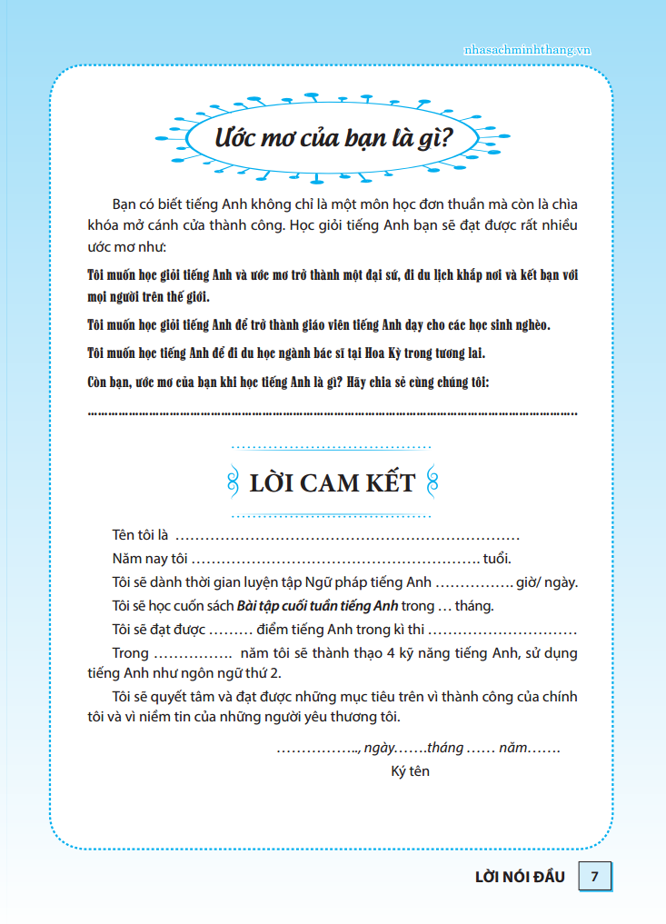 - Phần Week 2: Phần này giúp rèn luyện và hoàn thiện cả 4 kỹ năng giao tiếp: Nghe – Nói – Đọc – Viết tiếng Anh của các em. Kết hợp với các nội dung trong sách là đĩa CD với phát âm chuẩn tiếng Anh của người bản ngữ. Chúng tôi tin rằng CD này sẽ hỗ trợ các em rất nhiều trong quá trình rèn luyện kỹ năng giao tiếp tiếng Anh của mình. Chinh phục tiếng Anh để đạt được thành tích cao trong học tập và thi đỗ vào các trường Trung học phổ thông nổi tiếng, các trường THPT Chuyên Ngoại ngữ, giao tiếp thành thạo với người nước ngoài là ước mơ và mục tiêu phấn đấu của nhiều em học sinh. Để đạt được ước mơ đó chúng ta hãy bắt đầu lập kế hoạch học tiếng Anh ngay bây giờ nhé!