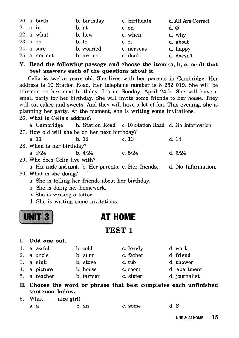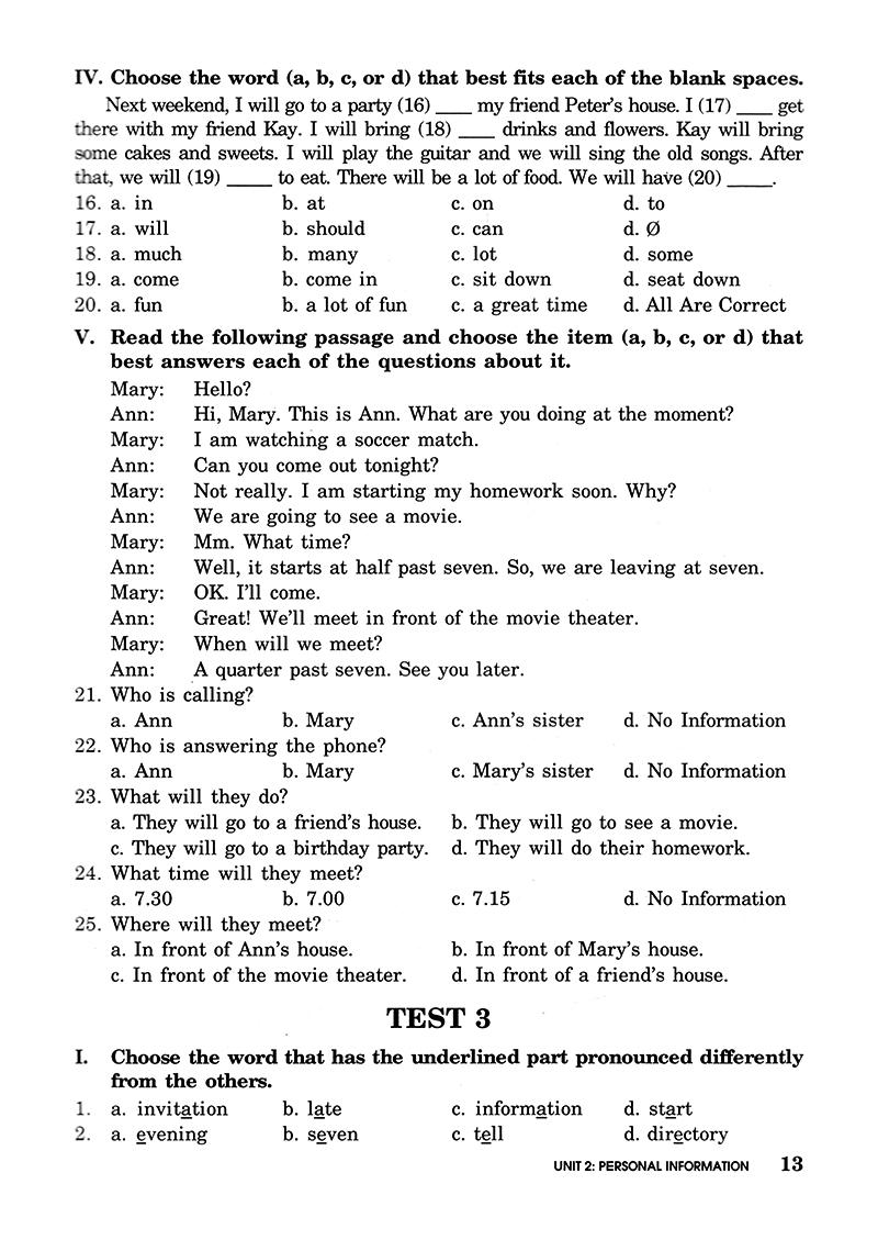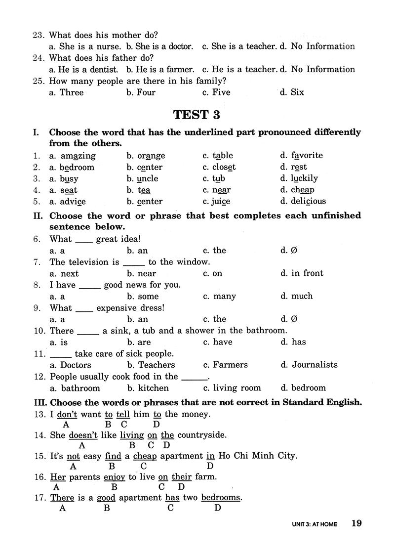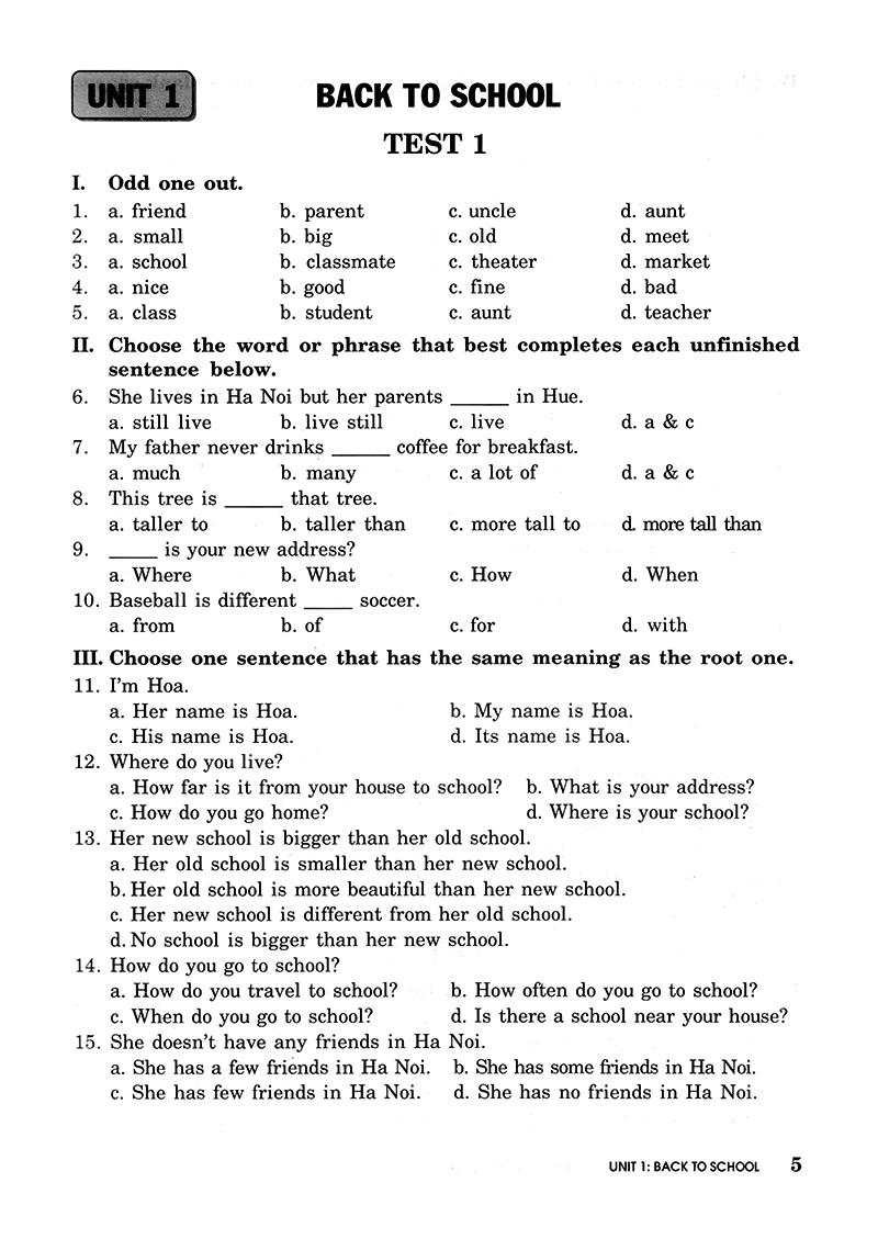 Mỗi Unit được soạn thành 3 Test; mỗi test gồm 25 đến 30 câu. Sau 3 đơn vị bài học có bài tự kiểm tra (Test Yourself) và sau Unit 8 và Unit 16 là 2 bài kiểm tra học kì gồm 35 câu, nhằm giúp các em ôn luyện và củng cố kiến thức đã học.