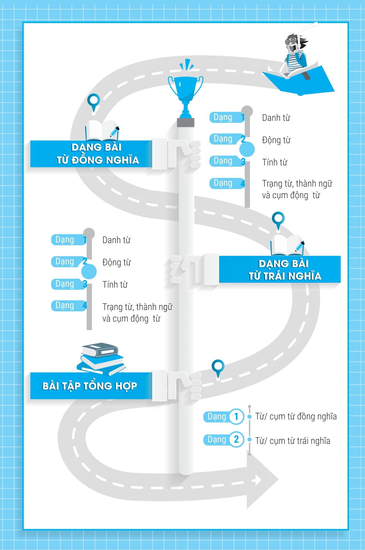 Sách còn bổ sung các dạng bài tập tổng hợp về cụm từ đồng nghĩa và cụm từ trái nghĩa thường gặp nhất, 100% xuất hiện trong đề thi