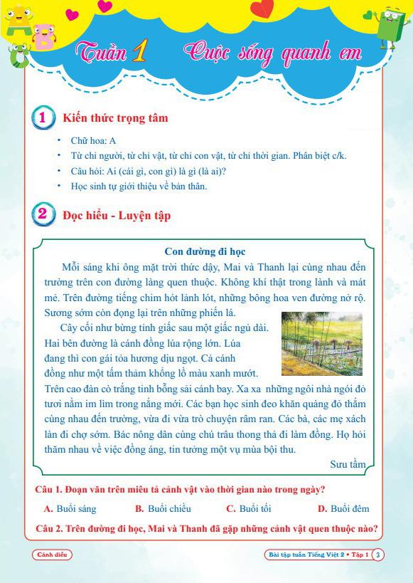 Cuốn sách Bài tập Tuần Tiếng Việt 2 - Tập 1 - Cánh diều bao gồm 18 tuần học từ tuần 1 đến tuần 18. Trong mỗi tuần học chúng tôi có tổng hợp các chủ đề, các dạng bài tập cơ bản, nâng cao nhằm giúp các em học sinh có điều kiện tự tin rèn luyện các dạng bài tập cơ bản cũng như rèn luyện khả năng tư duy ở những bài tập nâng cao. Bằng việc rèn luyện các bài tập theo từng tuần, học sinh dễ dàng ôn tập lại kiến thức trong tuần học để nắm chắc kiến thức, tự tin cho tuần học tiếp theo.