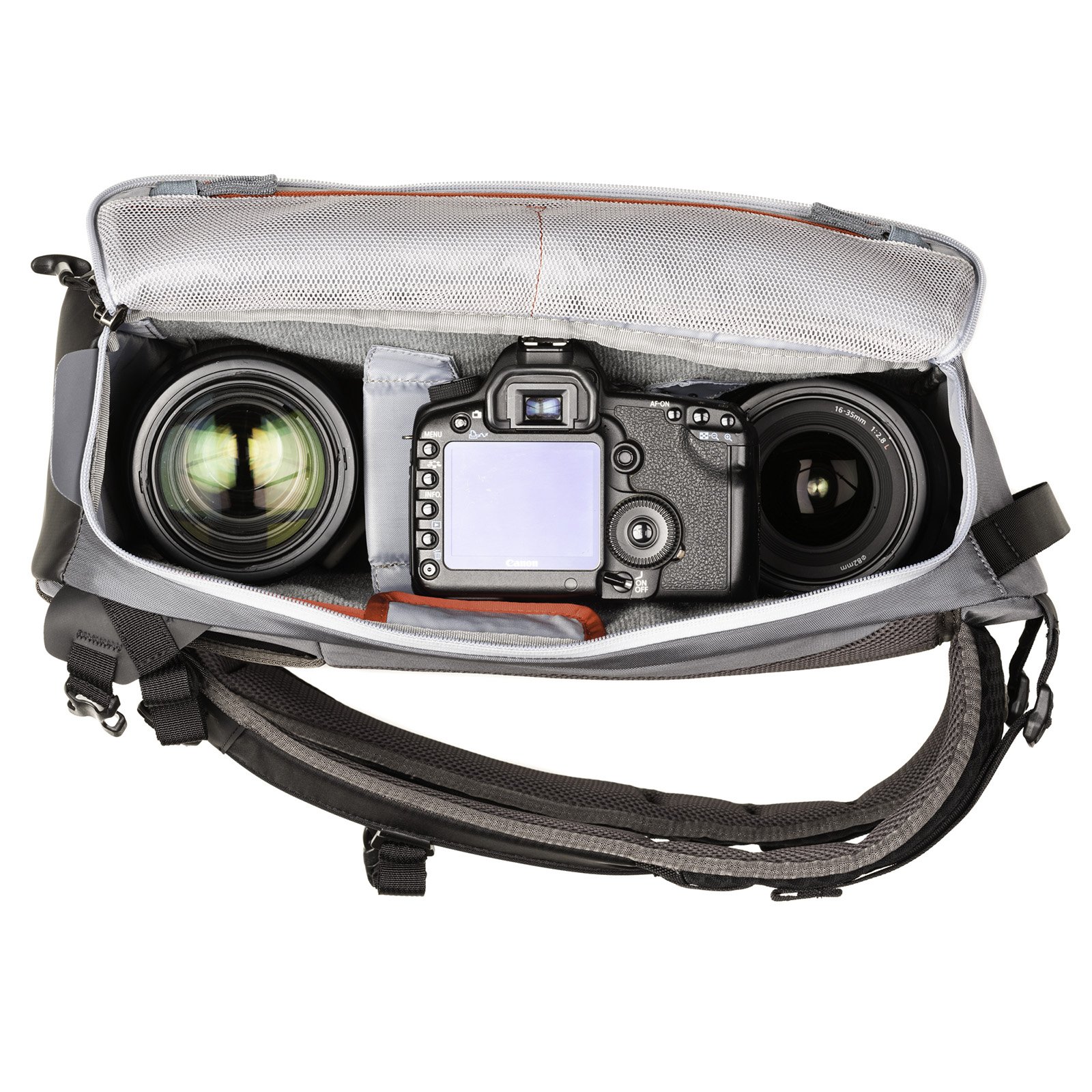 Balo máy ảnh Think Tank Backstory 13 với miệng túi chính ở vị trí phía sau giúp người dùng dễ dàng sắp xếp các thiết bị bên trong , cùng với ngăn phụ phía trên