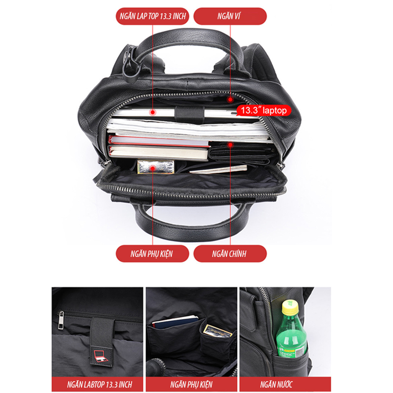 Kích thước : rộng 26cm X cao 37cm X dày 12cm Trọng lượng: 1.2 kg Dung tích: laptop 13.3 inch Màu sắc: Đen Phương pháp sản xuất: thủ công Chất liệu : Da BÒ THẬT Chức năng: thoáng khí, chống mài mòn, dễ làm sáng, chống sốc thiết kế : phong cách trẻ trung ,sang trọng, đẳng cấp