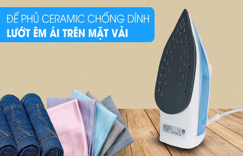 - Mặt đế bàn ủi phủ chống dính Ceramic bóng sáng, bền bỉ, lướt êm ái trên mọi mặt vải, dễ vệ sinh