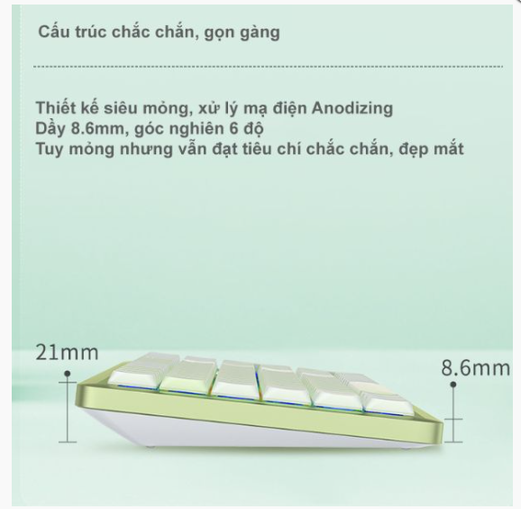Khung áp dụng kỹ thuật anodizing nhôm ( quá trình điện hóa nhằm làm tăng độ dày lớp oxit hình thành tự nhiên trên bề mặt nhôm từ nanomet thành micronmet), Thiết kế cấu trúc nhẹ và mỏng, độ dày của bàn phím mỏng tới 8.6mm và thiết kế góc công thái học 6 độ giúp bàn phím trở nên tinh tế và độc đáo hơn