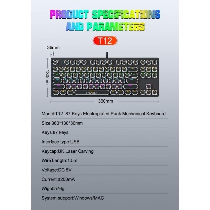 MÔ TẢ SẢN PHẨM Mô tả sản phẩm Bàn Phím cơ T-Wolf T12, Blue Switch, USB, LED, 87 Gaming bảo hành 12 tháng Bàn phím cơ T-WOLF T12 *Model: Bàn phím cơ Punk mạ điện