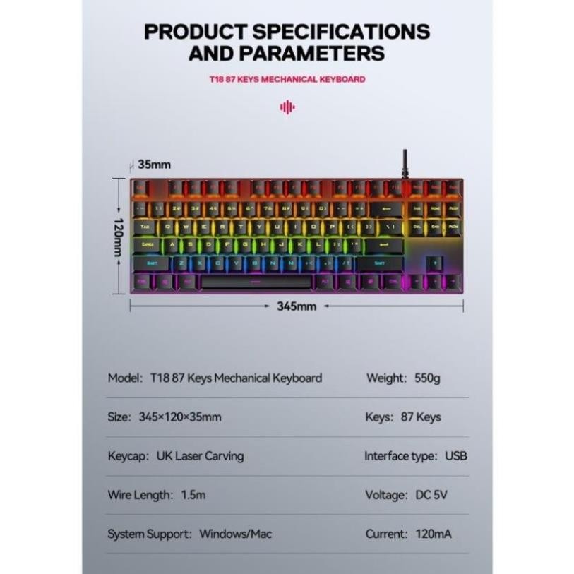 MÔ TẢ SẢN PHẨM Mô tả sản phẩm Bàn Phím cơ T-Wolf T18, Blue Switch, USB, LED, 87 Gaming Bàn Phím cơ T-Wolf T18 *Mechanical Keyboard *Weight: 550g *Size: 345×120×35mm *Keycap: UK Laser Carving *Keys:
